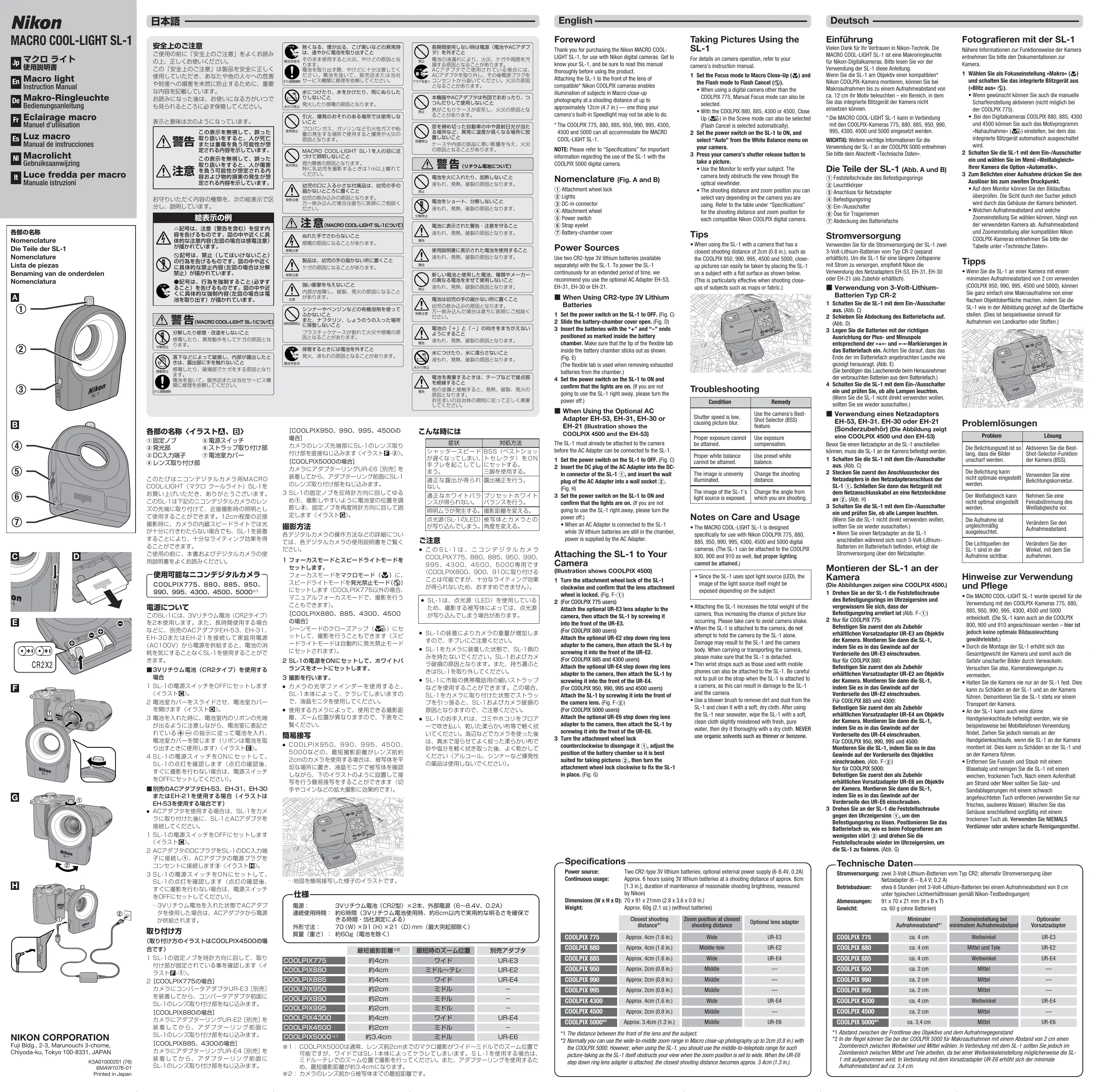 4500 et 5000 acceptent la lampe macro SL-1. REMARQUE: Consultez le chapitre "Spécifications" pour les informations importantes concernant l'emploi de la lampe MACRO COOL-LIGHT SL-1 avec le boîtier numérique COOLPIX 5000.