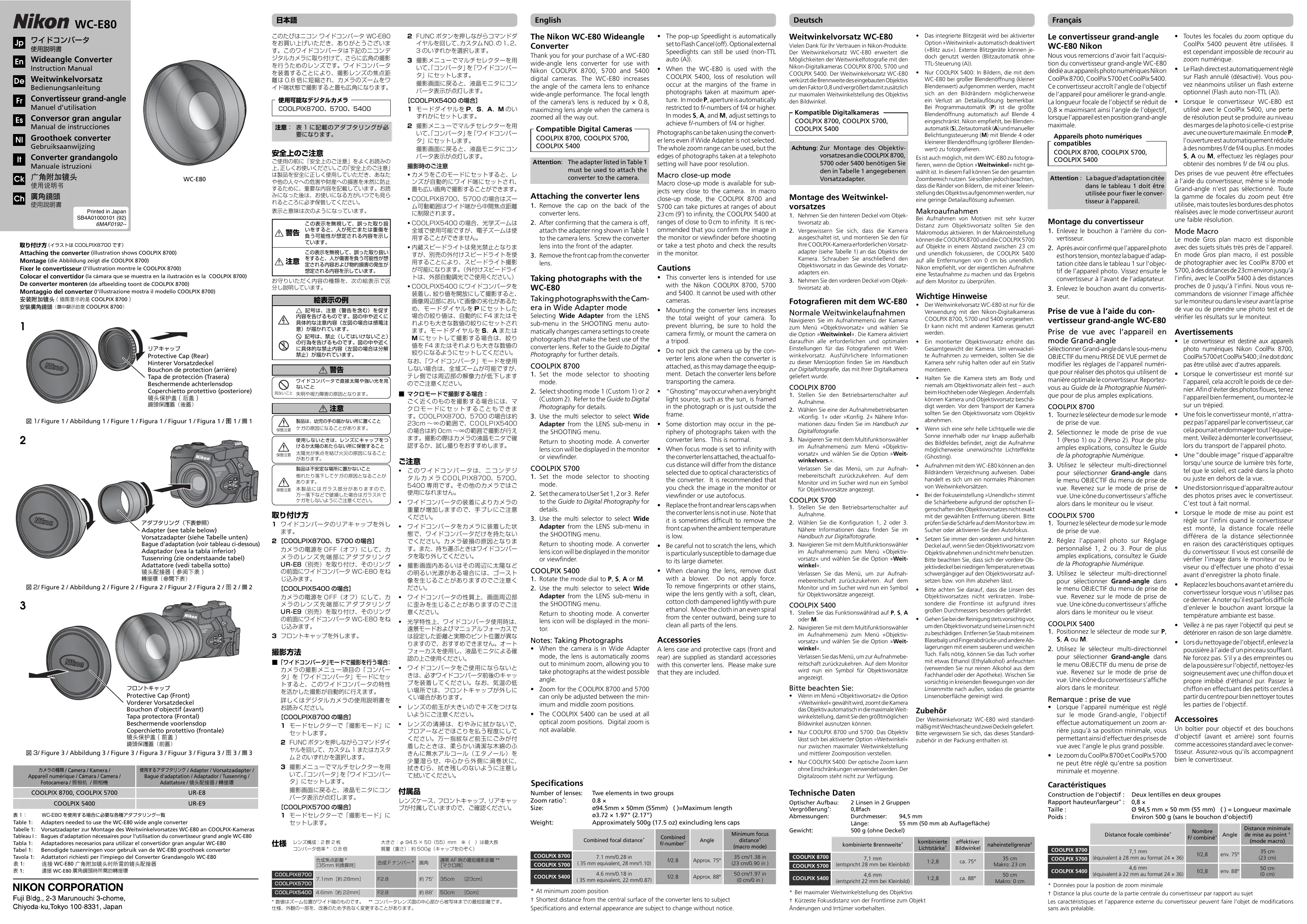 Nous vous remercions d'avoir fait l'acquisition du convertisseur grand-angle WC-E80 dédié aux appareils photo numériques Nikon CoolPix 8700, CoolPix 5700 et CoolPix 5400. Ce convertisseur accroît l'angle de l'objectif (Flash aille sur TTI (A))