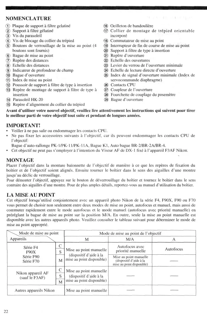 IMPORTANT! • Veiller a ne pas salir ou endommager les contacts CPU. • Ne pas fixer les accessoires suivants a 1'objectif, car ils peuvent endommager les contacts CPU de 1'objectif: Bague d'auto-rallonge PK-l/PK-11/PK-U A, Bague KI, Auto bague BR-2/BR-2A/BR-4. • Cet objectif ne peut pas s'employer a l'intention du Viseur AF de DX-1 fixe a l'appareil F3AF Nikon.