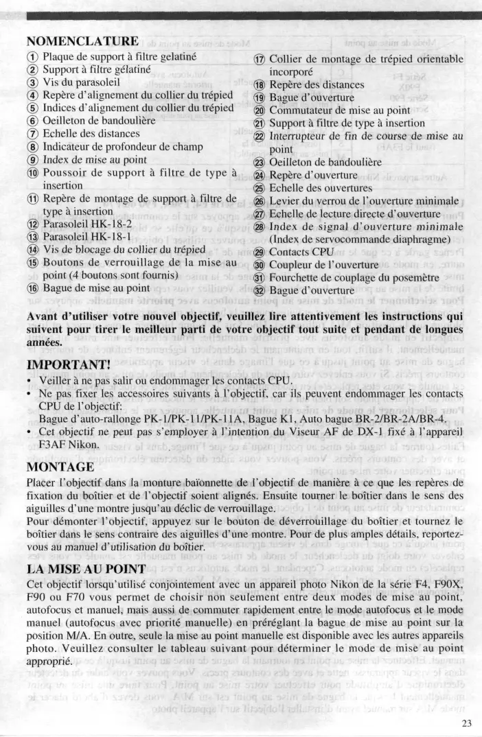 t f , NOMENCLATURE © Plaque de support a filtre gelatine © Support a filtre gelatine ® v i s du parasoleil © Repere d'alignement du collier du trepied © Indices d'alignement du collier du trepied © Oeilleton de bandouliere © Echelle des distances ® Indicateur de profondeur de champ © Index de mise au point @ Poussoir de support a filtre de type a insertion @ Repere de montage de support a filtre de type a insertion (J2) Parasoleil HK-18-2 (J5> Parasoleil HK-18-1 @ Vis de blocage du collier du trepied ® Boutons de verrouillage de la mise au point (4 boutons sont fournis) ® Bague de mise au point @ Collier de montage de trepied orientable incorpore @ R ep ere des distances (g Bague d'ouverture g) Commutateur de mise au point @ Support a filtre de type a insertion g , Interrupteur de fin de course de mise an point @ Oeilleton de bandouliere <g) Repere d'ouverture g) Echelle des ouvertures g) Levier du verrou de l'ouverture minimale @ Echelle de lecture directe d'ouverture g) Index de signal d'ouverture minimale (Index de servocommande diaphragme) <g Contacts CPU @ Coupleur de l'ouverture @ Fourchette de couplage du posemetre @ Bague d'ouverture Avant d'utiliser votre nouvel objectif, veuillez lire attentivement les instructions qui suivent pour tirer le meilleur parti de votre objectif tout suite et pendant de longues amices. IMPORTANT!