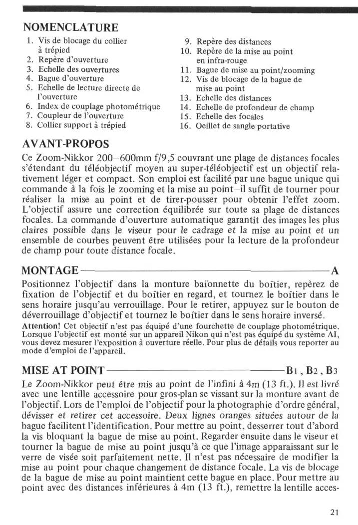 AVANT-PROPOS Ce Zoom-Nikkor 200—600mm f/9,5 couvrant une plage de distances focales s'etendant du teleobjectif moyen au super-teleobjectif est un objectif relativement leger et compact. Son emploi est facilite par une bague unique qui commande a la fois le zooming et la mise au point—il suffit de tourner pour realiser la mise au point et de tirer-pousser pour obtenir l'effet zoom. L'objectif assure une correction equilibree sur toute sa plage de distances focales. La commande d'ouverture automatique garantit des images les plus claires possible dans le viseur pour le cadrage et la mise au point et un ensemble de courbes peuvent etre utilisees pour la lecture de la profondeur de champ pour toute distance focale. MONTAGE A Positionnez l'objectif dans la monture baionnette du boftier, reperez de fixation de l'objectif et du boftier en regard, et toumez le boftier dans le sens horaire jusqu'au verrouillage. Pour le retirer, appuyez sur le bouton de deverrouillage d'objectif et toumez le boftier dans le sens horaire inverse. Attention! Cet objectif n'est pas equipe d'une fourchette de couplage photometrique. Lorsque l'objectif est monte sur un appareil Nikon qui n'est pas equipe du systeme AI, vous devez mesurer l'exposition a ouverture reelle. Pour plus de details vous reporter au mode d'emploi de l'appareil.