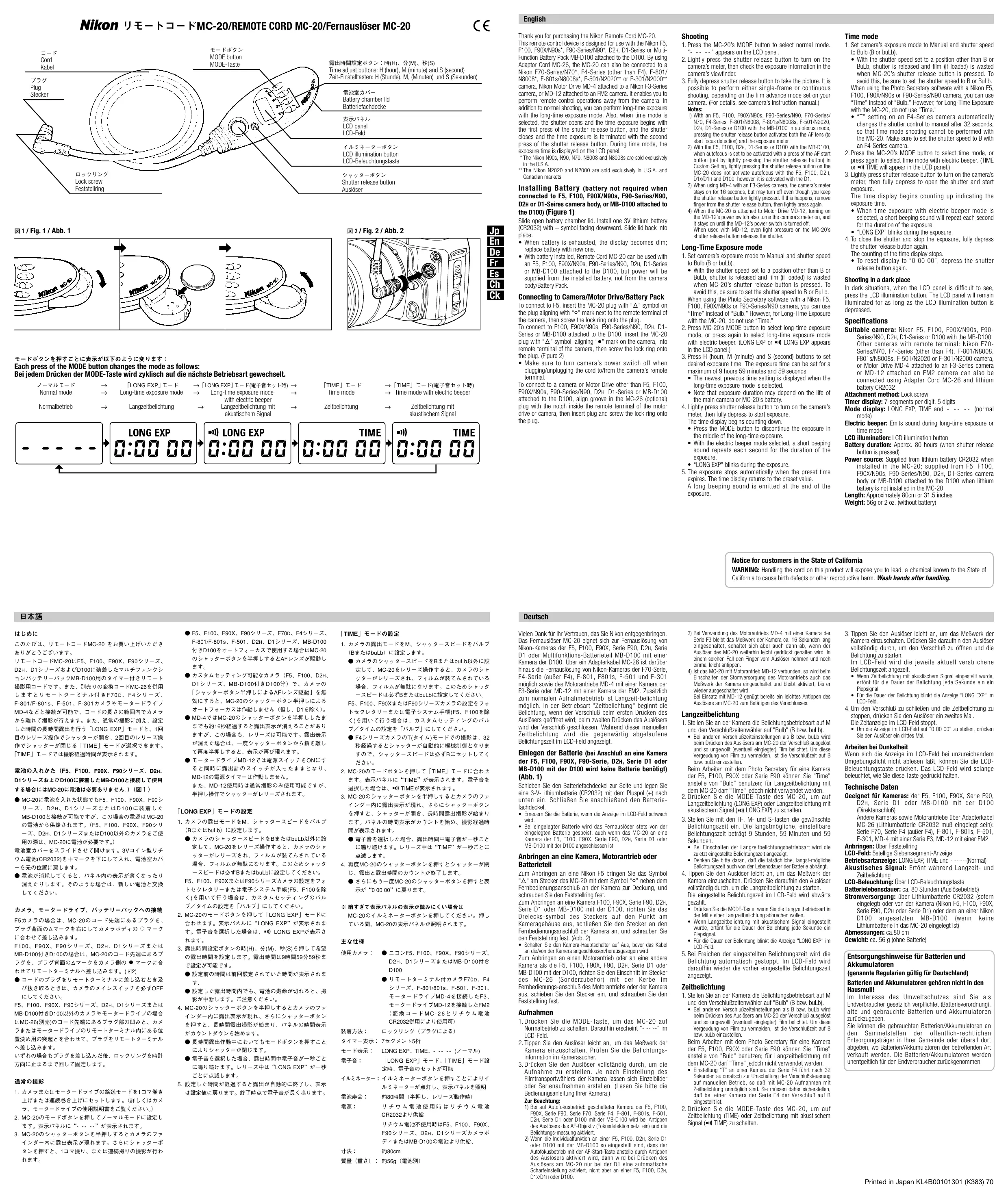 FrançaisI Merci de votre achat du câble de télécommande MC-20 Nikon. Ce disositif de télécommande a été spécialement conçu pour être utilisé avec les appareils photo Nikon de F5, F100, F90X, la série F90, D2 H , série D1 ou poinée d’alimentation multifonctions MB-D100 monté sur un appareil D100. Le MC-20 peut être aussi connecté par l’intermédiaire du câble adaptateur MC-26 aux appareils Nikon, de la F70, série F4 (autre que F4), F-801, F-801s, F-501/N2020* ou F-301/ N2000*, ou au moteur Nikon MD-4 monté sur un appareil Nikon F3 ou MD-12 monté sur un appareil FM2. Il vous permet de travailler en télécommande éloigné de l’appareil. Hormis les prises de vues normales, vous pouvez choisir d’avoir des temps d’exposition lents grâce au mode d’exposition longue durée. De plus, une fois que le mode d’affichage temporel est choisi, l’obturateur s’ouvre et l’exposition commence avec la première pression sur le bouton de commande de l’obturateur puis l’obturateur se referme et l’exposition est arrêté avec une autre pression sur le bouton de commande de l’obturateur. En mode d’affichage temporel, le temps d’exposition est affiché sur le panneau de commande.