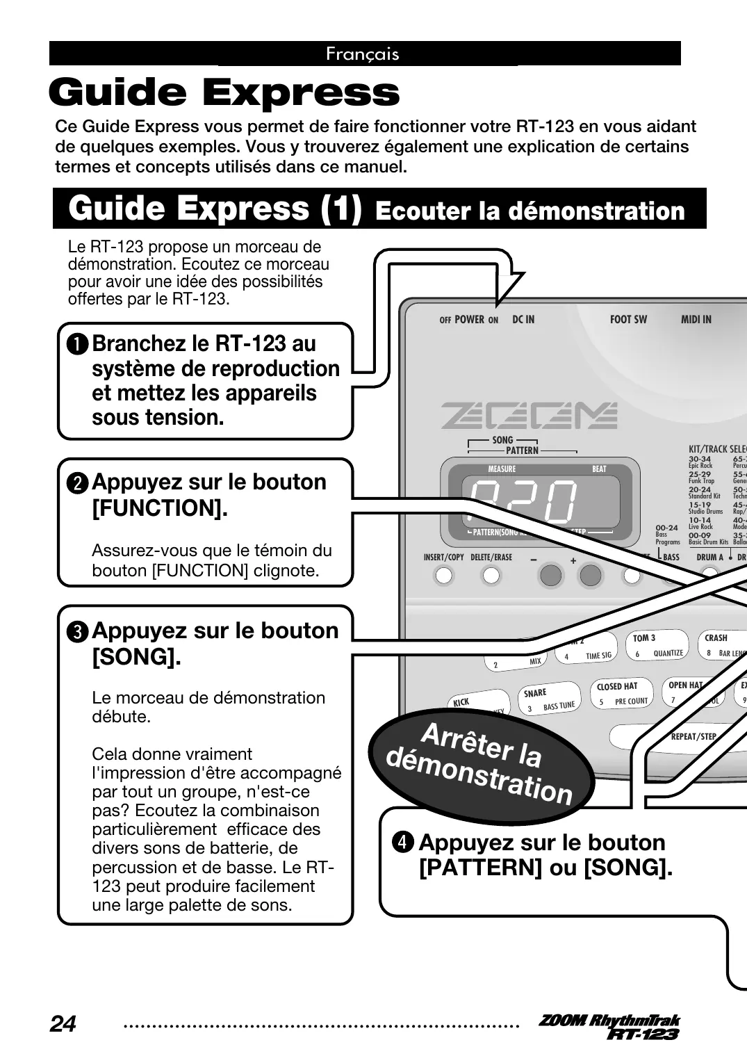 Français Guide Express Ce Guide Express vous permet de faire fonctionner votre RT-123 en vous aidant de quelques exemples. Vous y trouverez également une explication de certains termes et concepts utilisés dans ce manuel. Guide Express (1) Ecouter la démonstration Le RT-123 propose un morceau de démonstration. Ecoutez ce morceau pour avoir une idée des possibilités offertes par le RT-123. OFF POWER ON DC IN FOOT SW MIDI IN Branchez le RT-123 au système de reproduction et mettez les appareils sous tension. SONG PATTERN