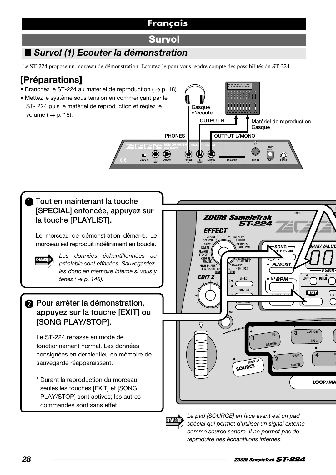 Français Survol ■ Survol (1) Ecouter la démonstration Le ST-224 propose un morceau de démonstration. Ecoutez-le pour vous rendre compte des possibilités du ST-224. [Préparations]