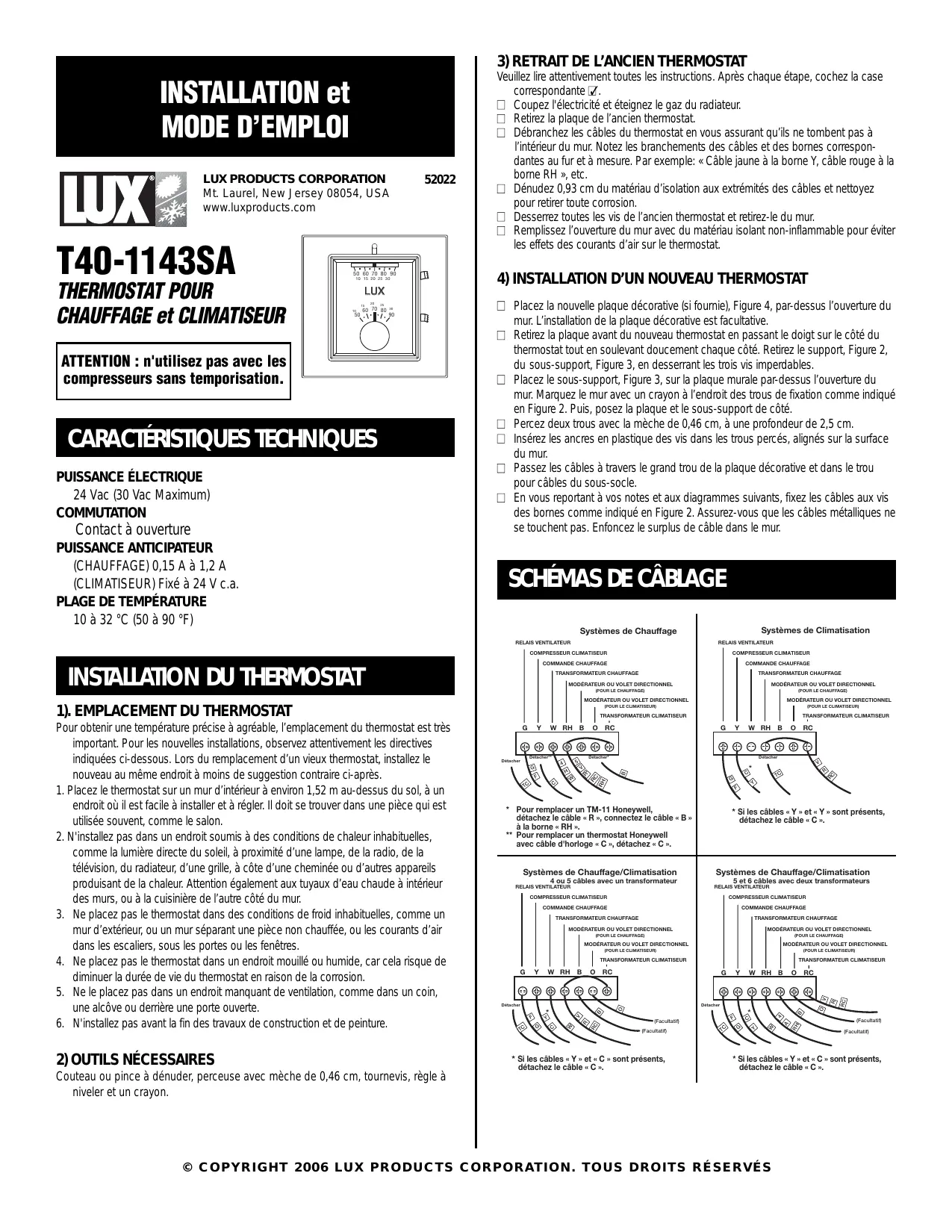 Si vous rencontrez des problèmes lors de l'installation ou de l'utilisation de votre thermostat, relisez attentivement les instructions de ce manuel. Si vous avez besoin d'assistance, veuillez contacter notre Département d'Assistance Technique au 856-234-8803 aux heures de bureau habituelles, entre 8h00 et 16h30 Heure Est US, du lundi au vendredi. Vous pouvez bénéficier d'une assistance technique à n'importe quelle heure, jour et nuit, sur http://www.luxproducts.com. Notre site internet vous fournit les réponses aux questions techniques les plus fréquentes, et vous permet également d'envoyer par courriel vos questions à notre support technique.
