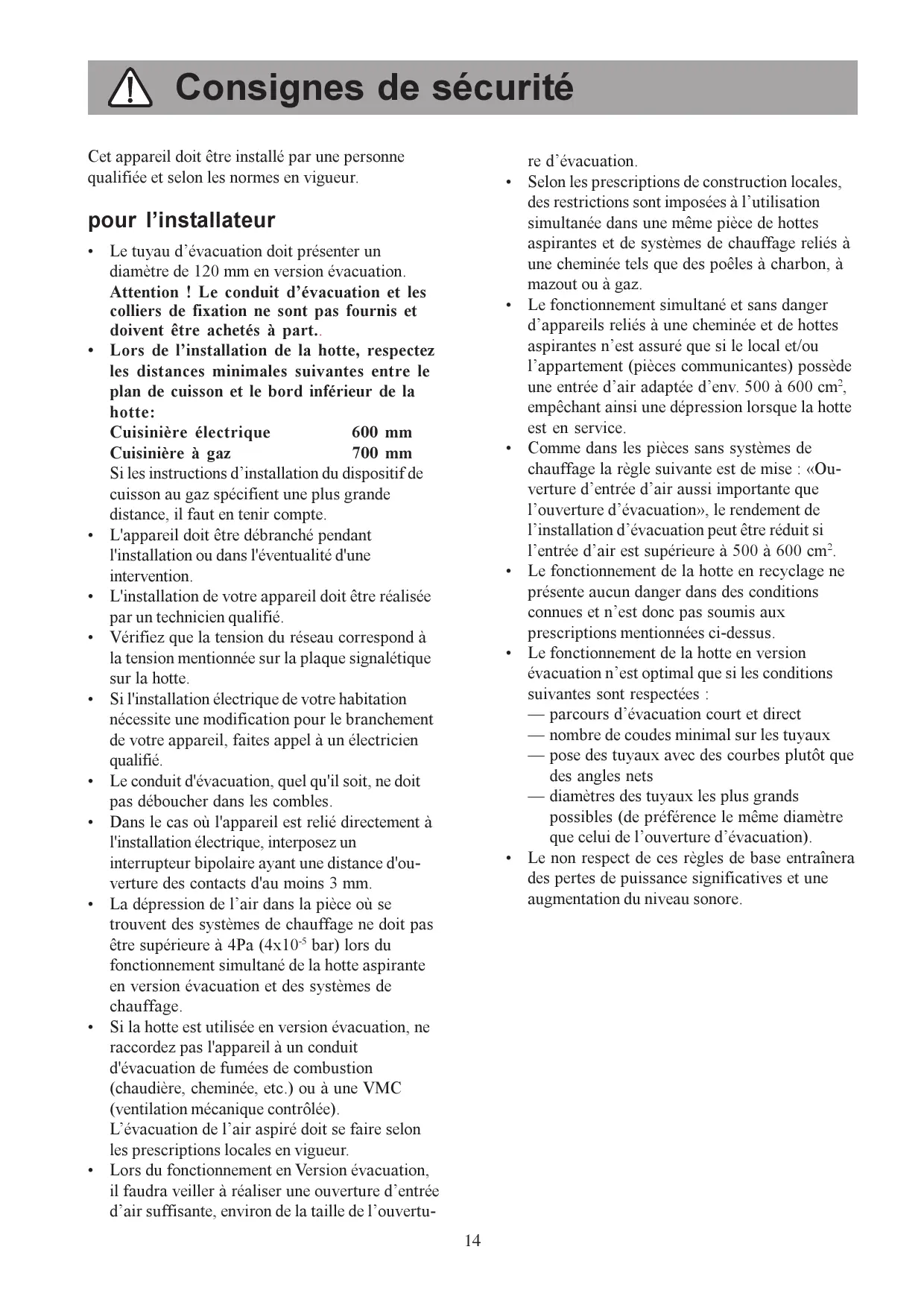 - La dépression de l'air dans la pièce où se trouvent des systèmes de chauffage ne doit pas être supérieure à 4Pa (4x10 ^-5 bar) lors du fonctionnement simultané de la hotte aspirante en version évacuation et des systèmes de chauffage.