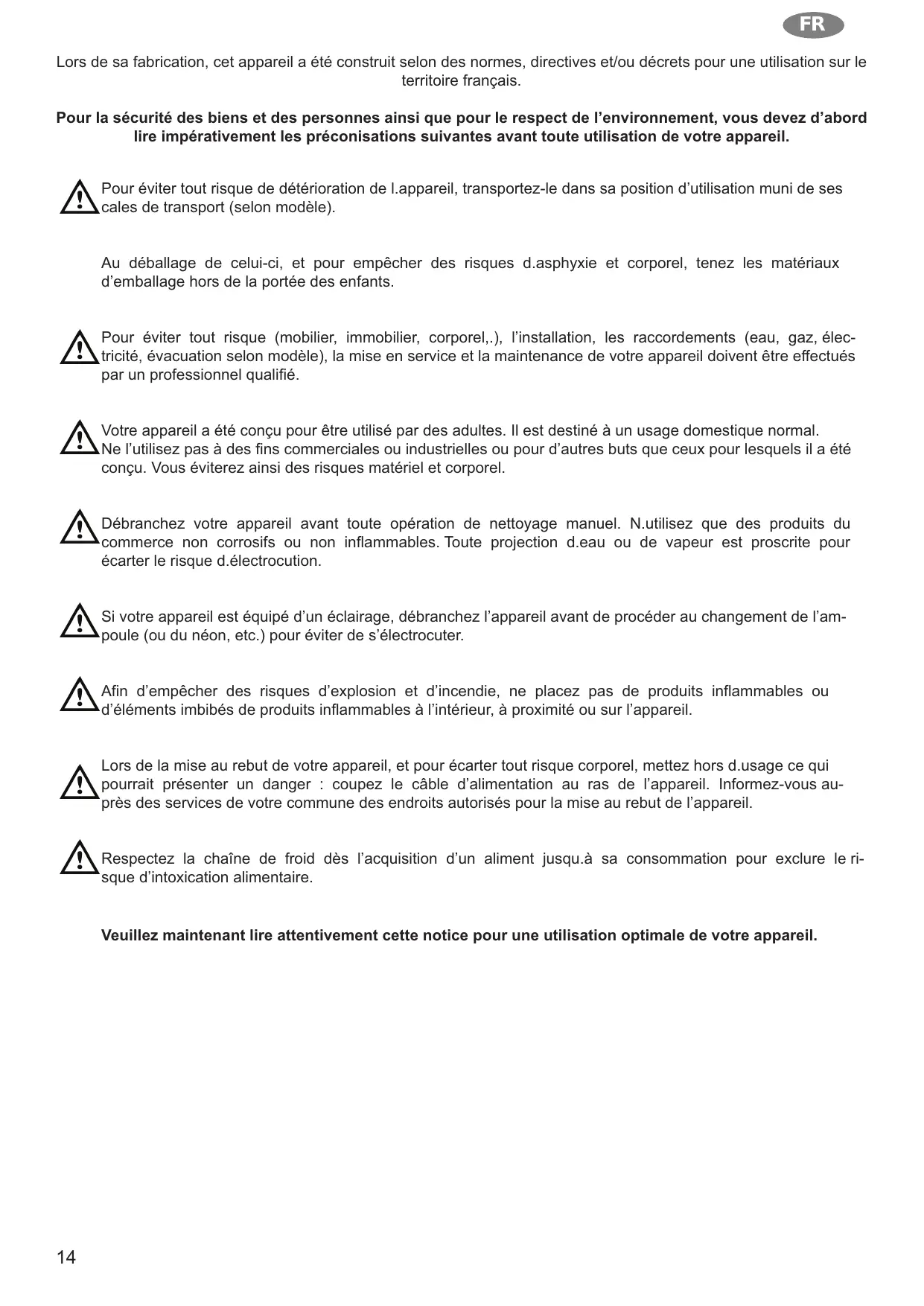 Pour la sécurité des biens et des personnes ainsi que pour le respect de l'environnement, vous doivent d'abord dirempératifement les préconisations suivantes avant toute utilisation de votre apparéil.