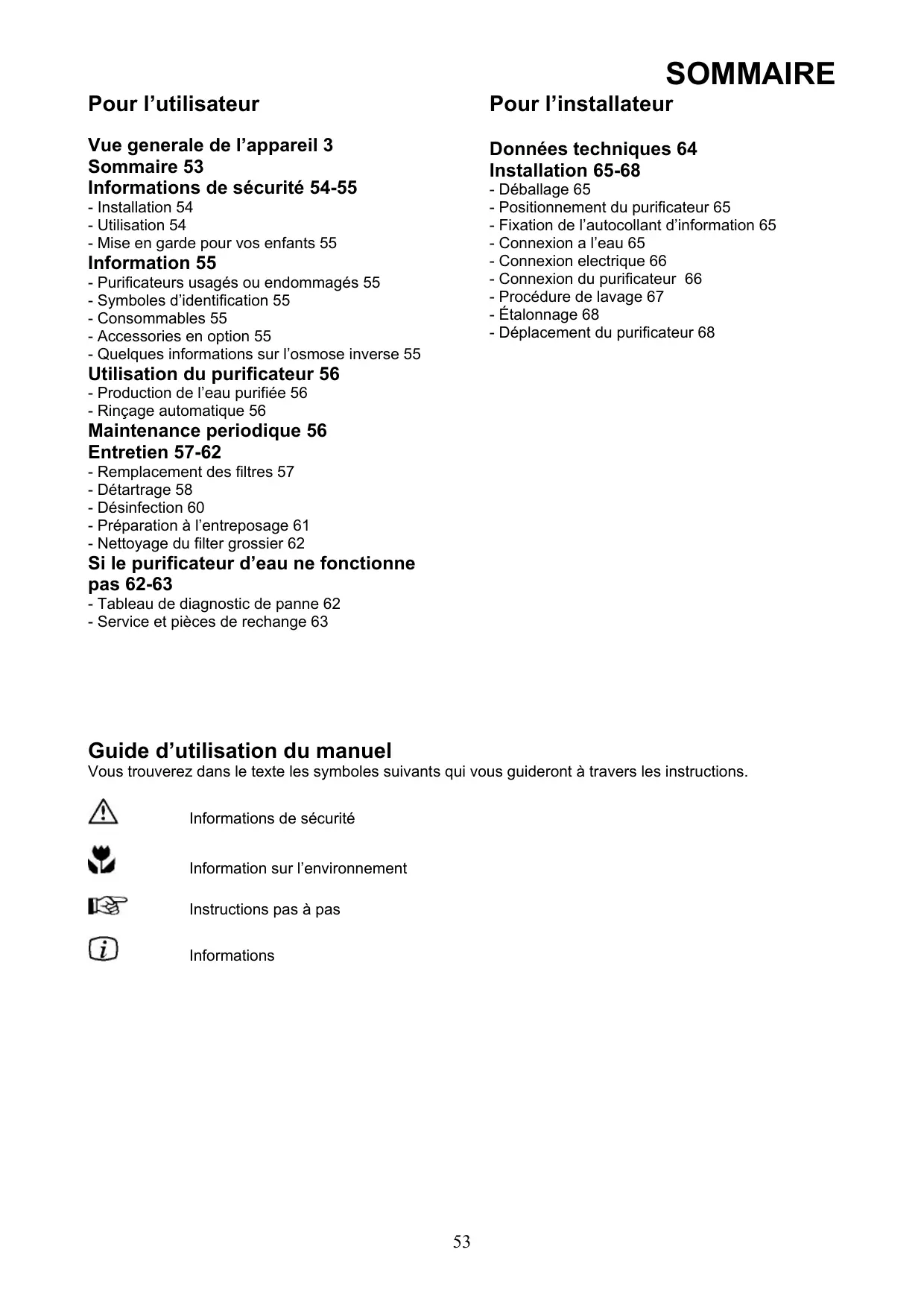 Pour l’utilisateur Vue generale de l’appareil 3 Sommaire 53 Informations de sécurité 54-55 - Installation 54 - Utilisation 54 - Mise en garde pour vos enfants 55 Information 55 - Purificateurs usagés ou endommagés 55 - Symboles d'identification 55 - Consommables 55 - Accessories en option 55 - Quelques informations sur l'osmose inverse 55 Utilisation du purificateur 56 - Production de l’eau purifiée 56 - Rinçage automatique 56 Maintenance periodique 56 Entretien 57-62 - Remplacement des filtres 57 - Détartrage 58 - Désinfection 60 - Préparation à l’entreposage 61 - Nettoyage du filter grossier 62 Si le purificateur d’eau ne fonctionne pas 62-63 - Tableau de diagnostic de panne 62 - Service et pièces de rechange 63 Guide d'utilisation du manuel SOMMAIRE Pour l'installateur Données techniques 64 Installation 65-68 - Déballage 65 - Positionnement du purificateur 65 - Fixation de l'autocollant d'information 65 - Connexion a l'eau 65 - Connexion electrique 66 - Connexion du purificateur 66 - Procédure de lavage 67 - Étalonnage 68 - Déplacement du purificateur 68 Vous trouverez dans le texte les symboles suivants qui vous guideront à travers les instructions. ÂÀ Informations de sécurité Ÿ Information sur l'environnement En Instructions pas à pas © Informations