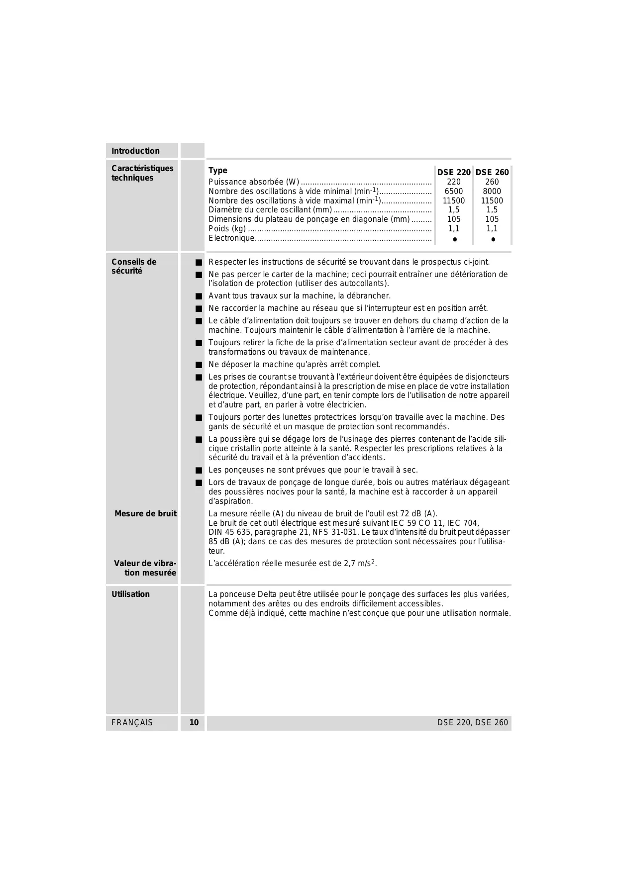 Type DSE 220 DSE 260 Puissance absorbée (W).. 220 260 Nombre des oscillations à vide minimal (min-1). 6500 | 8000 Nombre des oscillations à vide maximal (min) 11500 11500 Diamètre du cercle oscillant (mm). 1,5 1,5 Dimensions du plateau de ponçage en diagonale (mm) 105 105 Poids (kg) … 11 11 Electronique. . . Respecter les instructions de sécurité se trouvant dans le prospectus ci-joint. Ne pas percer le carter de la machine: ceci pourrait entraîner une détérioration de l'isolation de protection (utiliser des autocollants). Avant tous travaux sur la machine, la débrancher. Ne raccorder la machine au réseau que si l'interrupteur est en position arrêt. Le câble d'alimentation doit toujours se trouver en dehors du champ d'action de la machine. Toujours maintenir le câble d'alimentation à l'arrière de la machine. Toujours retirer la fiche de la prise d'alimentation secteur avant de procéder à des transformations ou travaux de maintenance. Ne déposer la machine qu'après arrêt complet. Les prises de courantse trouvant à l'extérieur doivent être équipées de disjoncteurs de protection, répondant ainsi à la prescription de mise en place de votre installation électrique. Veuillez, d'une part, en tenir compte lors de l'utilisation de notre appareil et d'autre part, en parler à votre électricien. Toujours porter des lunettes protectrices lorsqu'on travaille avec la machine. Des gants de sécurité et un masque de protection sont recommandés. La poussière qui se dégage lors de l'usinage des pierres contenant de l'acide sil- cique cristallin porte atteinte à la santé. Respecter les prescriptions relatives à la sécurité du travail et à la prévention d'accidents. Les ponçeuses ne sont prévues que pour le travail à sec. Lors de travaux de ponçage de longue durée, bois ou autres matériaux dégageant des poussières nocives pour la santé, la machine est à raccorder à un appareil d'aspiration: La mesure réelle (A) du niveau de bruit de l'outil est 72 dB (A). Le bruit de cet outil électrique est mesuré suivant IEC 59 CO 11, IEC 704, DIN 45 635, paragraphe 21, NFS 31-031. Le taux d'intensité du bruit peut dépasser 85 dB (A); dans ce cas des mesures de protection sont nécessaires pour l'utlisa- teur. L'accélération réelle mesurée est de 2,7 m/s2. La ponceuse Delta peut être utilisée pour le ponçage des surfaces les plus variées, notamment des arêtes ou des endroits difficilement accessibles. Comme déjà indiqué, cette machine n'est conçue que pour une utilisation normale. DSE 220, DSE 260