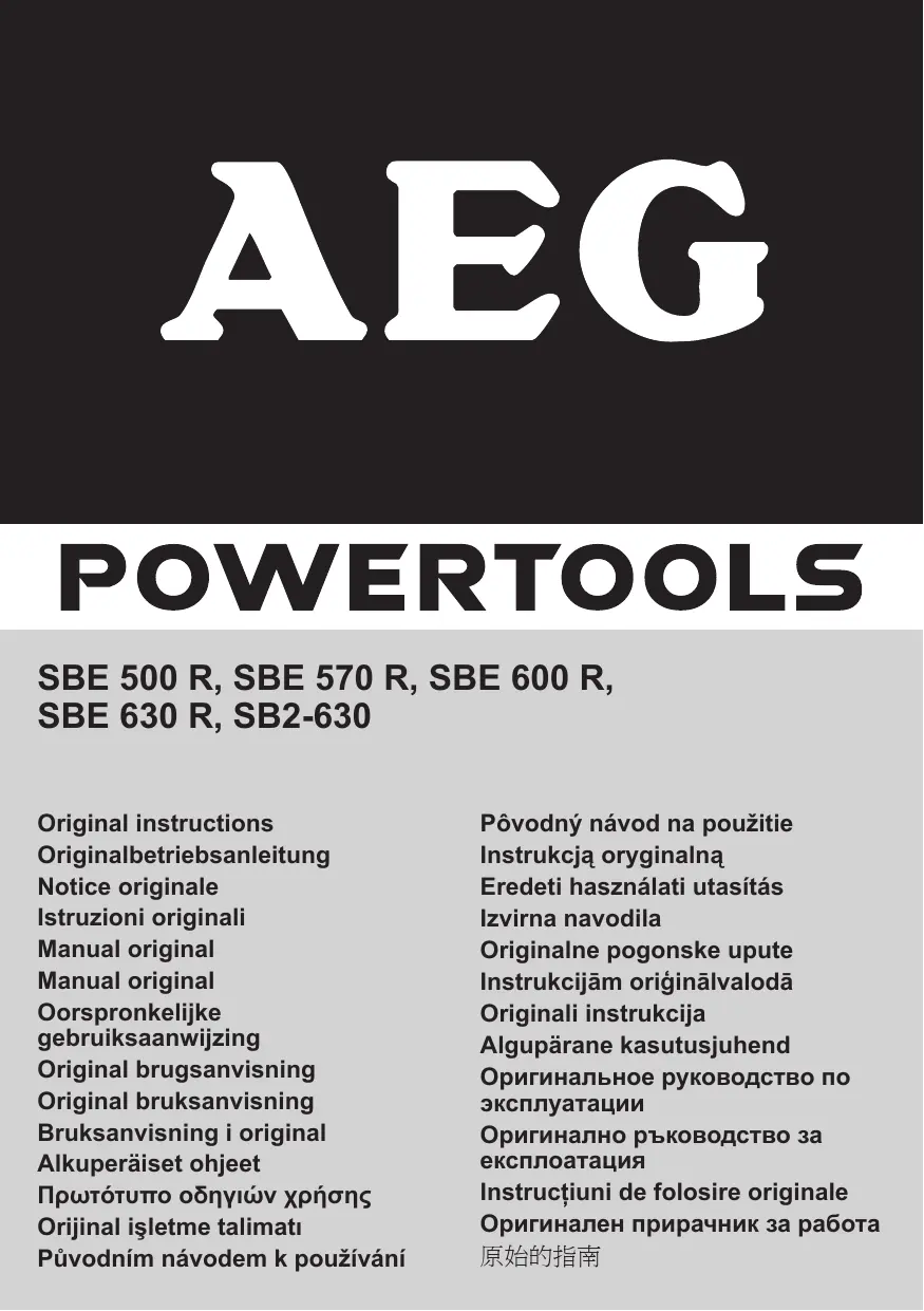 SBE 500 R SBE 570 R SBE 600 R SBE 630 R SB2-630 ENTRETIEN Puissance nominale de réception............................................ ..... 500 W............570 W............. 600 W..............630 W..............630 W Puissance utile......................................................................... ..... 250 W............285 W............. 300 W..............315 W..............315 W Vitesse de rotation à vide......................................................... 0-2650.min-1. 0-2700 min-1....0-2800 min-1.... 0-2800 min-1.......2800 min-1 1ère vitesse........................................................................... ..........- ................... - . ....................- . .................... - ...............2250 min-1 2ème vitesse......................................................................... ..........- ................... - . ....................- . .................... - ...............2800 min-1 Vitesse de rotation en charge................................................... ... 1800 min-1. ....1600 min-1....... 1300 min-1........1300 min-1 1ère vitesse........................................................................... ..........- ................... - . ....................- . .................... - .................850 min-1 2ème vitesse......................................................................... ..........- ................... - . ....................- . .................... - ...............1300 min-1 Perçage à percussion............................................................... . 39750 min-1. ..40500 min-1..... 42000 min-1......42000 min-1.....42000 min-1 Perçage à percussionen charge max....................................... . 27000 min-1. ..24000 min-1..... 19500 min-1......19500 min-1.....19500 min-1 Moment de blocage statique*, 1ère vitesse/2ème vitesse....... ....... 21 Nm............23 Nm............. 23 Nm..............23 Nm.........25/24 Nm ø de perçage dans le béton...................................................... ....... 13 mm...........15 mm............. 15 mm..............15 mm.............13 mm ø de perçage dans brique et grès argilo-calcaire..................... ....... 15 mm...........18 mm............. 18 mm..............18 mm.............15 mm ø de perçage dans acier........................................................... ....... 10 mm...........13 mm............. 13 mm..............13 mm.............13 mm ø de perçage dans aluminium.................................................. ....... 10 mm...........13 mm............. 13 mm..............13 mm.............13 mm ø de perçage dans bois............................................................ ....... 20 mm...........30 mm............. 30 mm..............30 mm.............30 mm Plage de serrage du mandrin................................................... .1,5-10 mm.... 1,5-13 mm.......1,5-13 mm....... 1,5-13 mm...... 1,5-13 mm Broche de perçage................................................................... .1/2"x20.........1/2"x20 . ......... 1/2"x20 . ..........1/2"x20 ...........1/2"x20 ø du collier de serrage.............................................................. ....... 43 mm...........43 mm............. 43 mm..............43 mm.............43 mm Poids sans câble de réseau..................................................... ...... 1,6 kg.............1,7 kg.............. 1,7 kg...............1,7 kg..............1,7 kg Accélération type évaluée au niveau du bras et de la main..... ......... 9 m/s2............9 m/s2. ............ 9 m/s2. .............9 m/s2..............9 m/s2 Niveaux sonores type évalués: Niveau de pression acoustique (K = 3 dB(A))......................... ........95 dB (A)........95 dB (A).......... 95 dB (A).......... 95 dB (A)..........95 dB (A) Niveau d‘intensité acoustique (K = 3 dB(A))........................... ......106 dB (A)......106 dB (A)........ 106 dB (A)........ 106 dB (A)........106 dB (A) Tenir toujours propres les orifices de ventilation de la machine. Au cas où la machine serait souvent utilisée en mode de percussion, il est recommandé d‘enlever les poussières se trouvant dans le mandrin de serrage à intervalles réguliers. Tenir la machine dans la position verticale, le mandrin de serrage vers le bas, et desserrer et resserrer le plus possible le mandrin de serrage. Toute la poussière accumulée tombe ainsi du mandrin de serrage. Il est recommandé d‘utiliser régulièrement le spray de nettoyage sur les mâchoires et les alésages des mâchoires de serrage. N‘utiliser que des pièces et accessoires AEG. Pour des pièces dont l‘échange n‘est pas décrit, s‘adresser de préférence aux stations de service après-vente AEG (voir brochure Garantie/Adresses des stations de service aprèsvente). Si besoin est, une vue éclatée de l‘appareil peut être fournie. S‘adresser, en indiquant bien le numéro à dix chiffres porté sur la plaque signalétique, à votre station de service après-vente (voir liste jointe) ou directement à AEG Elektrowerkzeuge, Max‑Eyth‑Straße 10, D‑71364 Winnenden, Germany. Valeurs de mesure obtenues conformément à la norme européenne 60 745. Les données indiquées sont valables pour des modèles à 230-240 V. En cas d‘autre tension du secteur, sont valables les valeurs figurant sur la plaque signalétique.