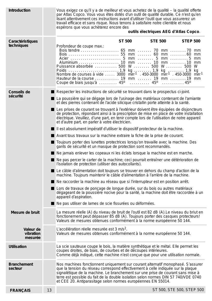 - Instruction d’utilisation Prière de lire et de conserver. Vous exigez ce qu’il y a de meilleur et vous achetez de la qualité – la qualité offerte par Atlas Copco. Vous vous êtes dotés d’un outil de qualité durable. Ce n’est qu’en lisant attentivement ces instructions avant d’utiliser l’outil que vous assurerez un travail efficace et sans risque. Nous tenons à satisfaire notre clientèle et nous espérons que vous achèterez encore des outils électriques AEG d’Atlas Copco. Caractéristiques techniques ST 500 STE 500 STEP 500 Profondeur de coupe max.: Bois tendre p. 65