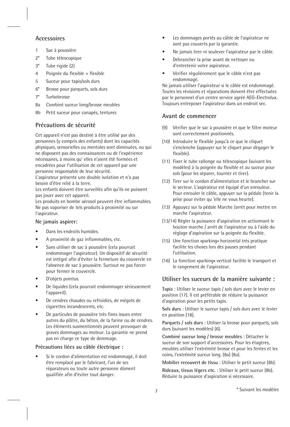 - Vérifie r régul ière m e nt q ue l e câbl e n’e st pas e ndom m agé. Ne jam ais util ise r l ’aspirate ur si l e câbl e e st e ndom m agé. Toute s l e s révisions e t réparations doive nt être e ffe ctuée s par l e pe rsonne ld’un ce ntre se rvice agréé AEG- El e ctrol ux. Toujours e ntre pose r l ’aspirate ur dans un e ndroit se c. Précautions de sécurité (9 ) Ce t appare iln’e st pas de stiné à être util isé par de s pe rsonne s (y com pris de s e nfants) dont l e s capacités ph ysiq ue s, se nsorie l e s ou m e ntal e s sont dim inuée s, ou q ui ne dispose nt pas de s connaissance s ou de l ’e xpérie nce néce ssaire s, à m oins q u’ e l e s n’aie nt été form ée s e t e ncadrée s pour l ’util isation de ce t appare ilpar une pe rsonne re sponsabl e de l e ur sécurité. L’aspirate ur prése nte une doubl e isol ation e t n’a pas be soin d’être re l ié à l a te rre . Le s e nfants doive nt être surve il és afin q u’il s ne puisse nt pas joue r ave c ce t appare il Le s produits e n bom be aérosolpe uve nt être infl am m abl e s. Ne pas vaporise r de te l s produits à proxim ité ou sur ’aspirate ur. Vérifie r q ue l e sac à poussière e t q ue l e fil tre m ote ur sont corre cte m e nt positionnés. (10) Introduire l e fl e xibl e jusq u’à ce q ue l e cl iq ue t s’e ncl e nch e (appuye r sur l e cl iq ue t pour dégage r l