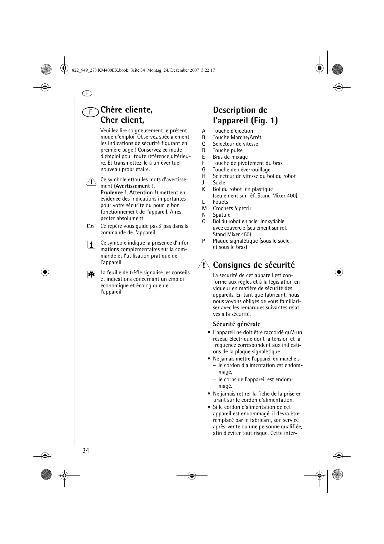 Ce symbole et/ou les mots d'avertissement (Avertissement!, Prudence!, Attention!) mettent en évidence des indications importantes pour votre sécurité ou pour le bon fonctionnement de l'appareil. A respecter absolument.