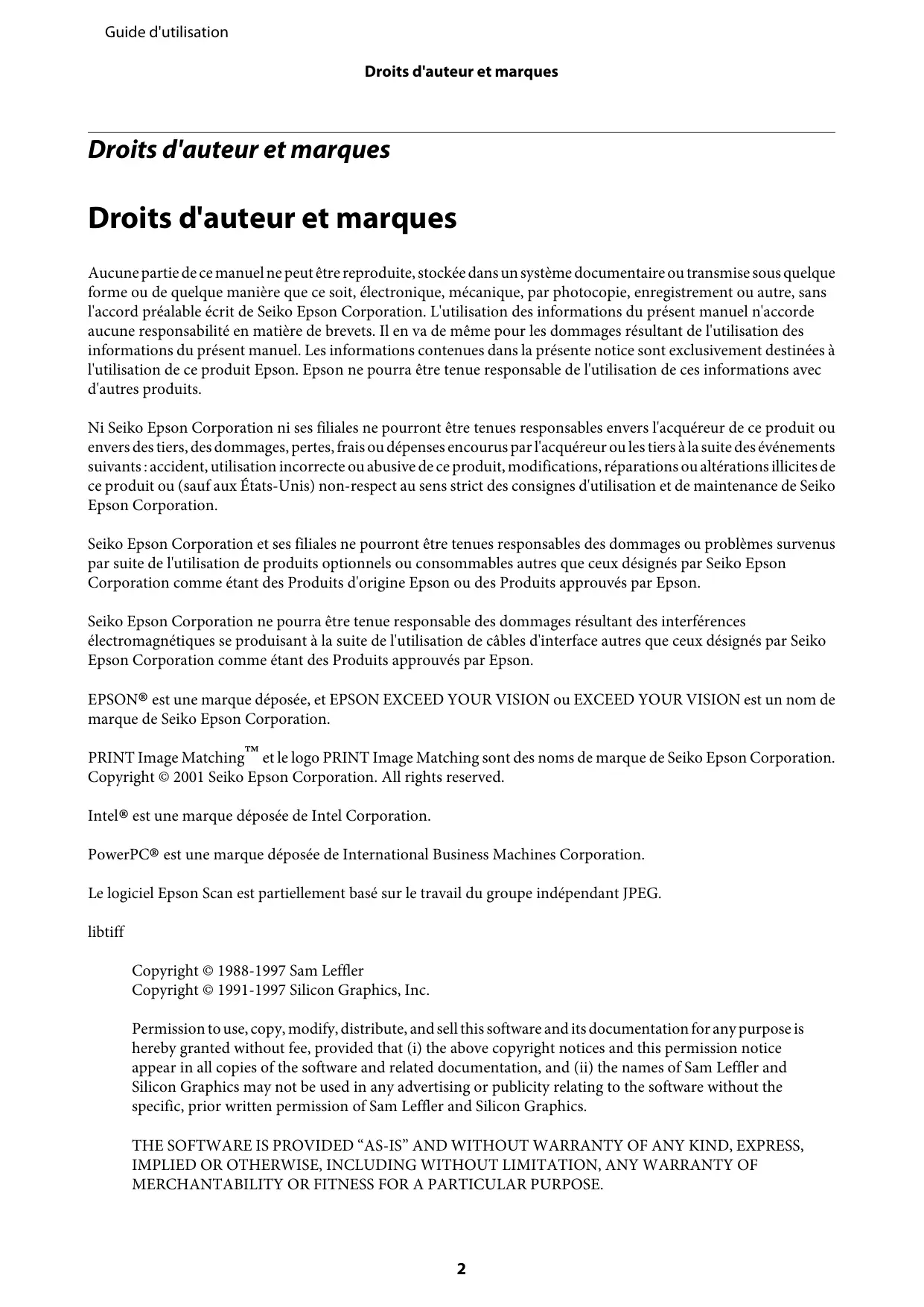 Guide d'utilisation Droits d'auteur et marques Droits d'auteur et marques Droits d'auteur et marques Aucune partie de ce manuel ne peut être reproduite, stockée dans un système documentaire ou transmise sous quelque forme ou de quelque manière que ce soit, électronique, mécanique, par photocopie, enregistrement ou autre, sans l'accord préalable écrit de Seiko Epson Corporation. L'utilisation des informations du présent manuel n'accorde aucune responsabilité en matière de brevets. Il en va de même pour les dommages résultant de l'utilisation des informations du présent manuel. Les informations contenues dans la présente notice sont exclusivement destinées à l'utilisation de ce produit Epson. Epson ne pourra être tenue responsable de l'utilisation de ces informations avec d'autres produits. Ni Seiko Epson Corporation ni ses filiales ne pourront être tenues responsables envers l'acquéreur de ce produit ou envers des tiers, des dommages, pertes, frais ou dépenses encourus par l'acquéreur ou les tiers à la suite des événements suivants : accident, utilisation incorrecte ou abusive de ce produit, modifications, réparations ou altérations illicites de ce produit ou (sauf aux États-Unis) non-respect au sens strict des consignes d'utilisation et de maintenance de Seiko Epson Corporation. Seiko Epson Corporation et ses filiales ne pourront être tenues responsables des dommages ou problèmes survenus par suite de l'utilisation de produits optionnels ou consommables autres que ceux désignés par Seiko Epson Corporation comme étant des Produits d'origine Epson ou des Produits approuvés par Epson. Seiko Epson Corporation ne pourra être tenue responsable des dommages résultant des interférences électromagnétiques se produisant à la suite de l'utilisation de câbles d'interface autres que ceux désignés par Seiko Epson Corporation comme étant des Produits approuvés par Epson.