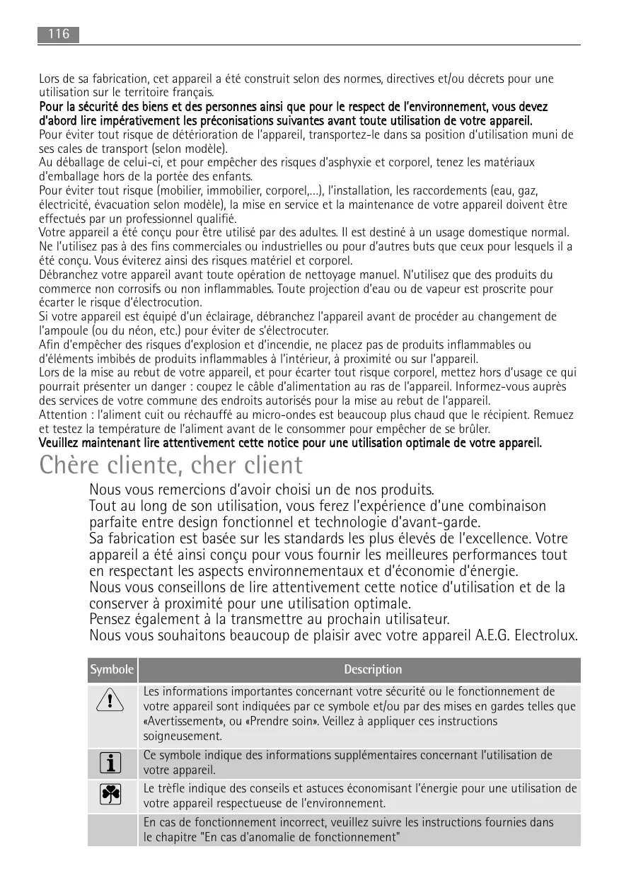 Lors de sa fabrication, cet appareil a été construit selon des normes, directives et/ou décrets pour une utilisation sur le territoire français. Pour la sécurité des biens et des personnes ainsi que pour le respect de l’environnement, vous devez d’abord lire impérativement les préconisations suivantes avant toute utilisation de votre appareil. Pour éviter tout risque de détérioration de l’appareil, transportez-le dans sa position d’utilisation muni de ses cales de transport (selon modèle). Au déballage de celui-ci, et pour empêcher des risques d’asphyxie et corporel, tenez les matériaux d’emballage hors de la portée des enfants. Pour éviter tout risque (mobilier, immobilier, corporel,…), l’installation, les raccordements (eau, gaz, électricité, évacuation selon modèle), la mise en service et la maintenance de votre appareil doivent être effectués par un professionnel qualifié. Votre appareil a été conçu pour être utilisé par des adultes. Il est destiné à un usage domestique normal. Ne l’utilisez pas à des fins commerciales ou industrielles ou pour d’autres buts que ceux pour lesquels il a été conçu. Vous éviterez ainsi des risques matériel et corporel. Débranchez votre appareil avant toute opération de nettoyage manuel. N’utilisez que des produits du commerce non corrosifs ou non inflammables. Toute projection d’eau ou de vapeur est proscrite pour écarter le risque d’électrocution. Si votre appareil est équipé d’un éclairage, débranchez l’appareil avant de procéder au changement de l’ampoule (ou du néon, etc.) pour éviter de s’électrocuter. Afin d’empêcher des risques d’explosion et d’incendie, ne placez pas de produits inflammables ou d’éléments imbibés de produits inflammables à l’intérieur, à proximité ou sur l’appareil. Lors de la mise au rebut de votre appareil, et pour écarter tout risque corporel, mettez hors d’usage ce qui pourrait présenter un danger : coupez le câble d’alimentation au ras de l’appareil. Informez-vous auprès des services de votre commune des endroits autorisés pour la mise au rebut de l’appareil. Attention : l’aliment cuit ou réchauffé au micro-ondes est beaucoup plus chaud que le récipient. Remuez et testez la température de l’aliment avant de le consommer pour empêcher de se brûler. Veuillez maintenant lire attentivement cette notice pour une utilisation optimale de votre appareil. Chère cliente, cher client Nous vous remercions d’avoir choisi un de nos produits. Tout au long de son utilisation, vous ferez l’expérience d’une combinaison parfaite entre design fonctionnel et technologie d’avant-garde. Sa fabrication est basée sur les standards les plus élevés de l’excellence. Votre appareil a été ainsi conçu pour vous fournir les meilleures performances tout en respectant les aspects environnementaux et d’économie d’énergie. Nous vous conseillons de lire attentivement cette notice d’utilisation et de la conserver à proximité pour une utilisation optimale. Pensez également à la transmettre au prochain utilisateur. Nous vous souhaitons beaucoup de plaisir avec votre appareil A.E.G. Electrolux. Symbole Description Les informations importantes concernant votre sécurité ou le fonctionnement de votre appareil sont indiquées par ce symbole et/ou par des mises en gardes telles que «Avertissement», ou «Prendre soin». Veillez à appliquer ces instructions soigneusement. Ce symbole indique des informations supplémentaires concernant l’utilisation de votre appareil. Le trèfle indique des conseils et astuces économisant l’énergie pour une utilisation de votre appareil respectueuse de l’environnement. En cas de fonctionnement incorrect, veuillez suivre les instructions fournies dans le chapitre "En cas d'anomalie de fonctionnement" Sommaire