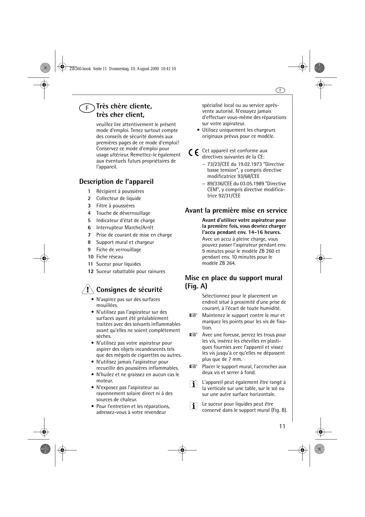 Avec un accu à pleine charge, vous pouvez passer l'aspirateur pendant env. 9 minutes pour le modèle ZB 260 et pendant env. 10 minutes pour le modèle ZB 264.