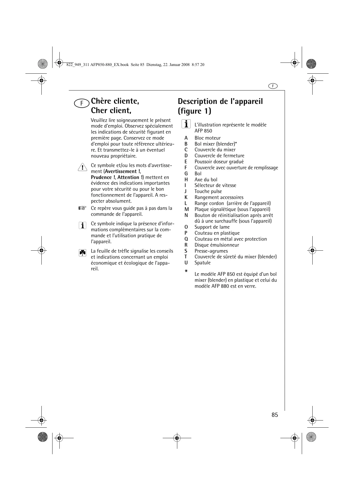 L'illustration représente le modèle AFP 850 A Bloc moteur B Bol mixer (blender) C Couvercle du mixer D Couvercle de fermeture E Poussoir doseur gradué F Couvercle avec ouverture de remplissage G Bol H Axe du bol I Sélecteur de vitesse J Touche pulse K Rangement accessoires L Range cordon (arrière de l'appareil) M Plaque signalétique (sous l'appareil) N Bouton de réinitialisation après arrêt d'une surchauffe (sous l'appareil) O Support de lame P Couteau en plastique Q Couteau en métal avec protection R Disque émulsionneur S Presse-agrumes T Couvercle de sécurité du mixer (blender) U Spatule Le modèle AFP 850 est équipé d'un bol mixer (blender) en plastique et celui du modèle AFP 880 est en verre.