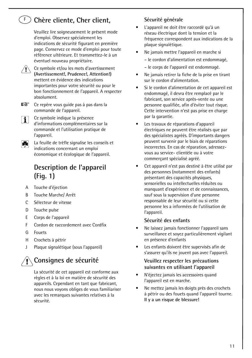 Ch ère cl ie nte , Ch e r cl ie nt, Ve uil ez l ire soigne use m e nt l e prése nt m ode d'e m pl oi. O bse rve z spécial e m e nt l indications de sécurité figurant e n pre m ière page . Conse rve z ce m ode d'e m pl oi pour toute référe nce ul térie ure . Et transm e tte z- l e à un éve ntue lnouve au propriétaire . Ce sym bol e e t/ou l e s m ots d’ave rtisse m e nt (Ave rtisse m e nt!, Prude nce !, Atte ntion!) m e tte nt e n évide nce de s indications im portante s pour votre sécurité ou pour l bon fonctionne m e nt de l ’appare il . A re spe cte r absol um e nt. Ce re père vous guide pas à pas dans l com m ande de l ’appare il Ce sym bol e indiq ue l a prése nce d’inform ations com pl ém e ntaire s sur l com m ande e t l ’util isation pratiq ue de ’appare il La fe uil e de trèfl e signal ise l e s conse il s et indications conce rnant un e m pl économ iq ue e t écol ogiq ue de l ’appare il