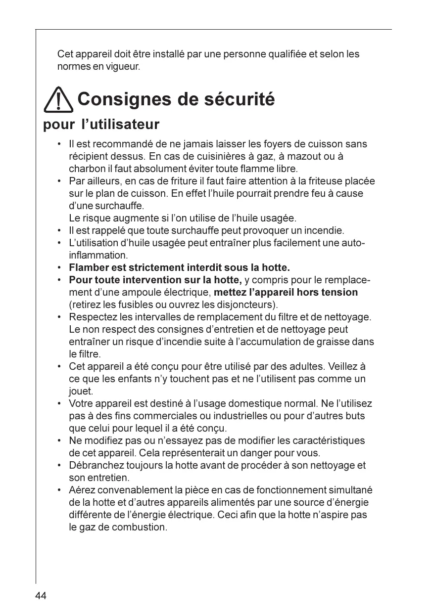 Cet appareil doit être installé par une personne qualifiée et selon les normes en vigueur. AN Consignes de sécurité pour l'utilisateur Il est recommandé de ne jamais laisser les foyers de cuisson sans récipient dessus. En cas de cuisinières à gaz, à mazout ou à charbon il faut absolument éviter toute flamme libre. Par ailleurs, en cas de friture il faut faire attention à la friteuse placée sur le plan de cuisson. En effet l'huile pourrait prendre feu à cause d'une surchauffe. Le risque augmente si l'on utilise de l'huile usagée. Il est rappelé que toute surchauffe peut provoquer un incendie. L'utilisation d'huile usagée peut entraîner plus facilement une auto- inflammation. Flamber est strictement interdit sous la hotte. Pour toute intervention sur la hotte, y compris pour le remplace- ment d’une ampoule électrique, mettez l'appareil hors tension (retirez les fusibles ou ouvrez les disjoncteurs). Respectez les intervalles de remplacement du filtre et de nettoyage. Le non respect des consignes d'entretien et de nettoyage peut entraîner un risque d'incendie suite à l'accumulation de graisse dans le filtre. Cet appareil a été conçu pour être utilisé par des adultes. Veillez à ce que les enfants n’y touchent pas et ne l'utilisent pas comme un jouet. Votre appareil est destiné à l'usage domestique normal. Ne l’utilisez pas à des fins commerciales ou industrielles ou pour d'autres buts que celui pour lequel il a été conçu. Ne modifiez pas ou n'essayez pas de modifier les caractéristiques de cet appareil. Cela représenterait un danger pour vous. Débranchez toujours la hotte avant de procéder à son nettoyage et son entretien. Aérez convenablement la pièce en cas de fonctionnement simultané de la hotte et d'autres appareils alimentés par une source d'énergie différente de l'énergie électrique. Ceci afin que la hotte n’aspire pas le gaz de combustion.