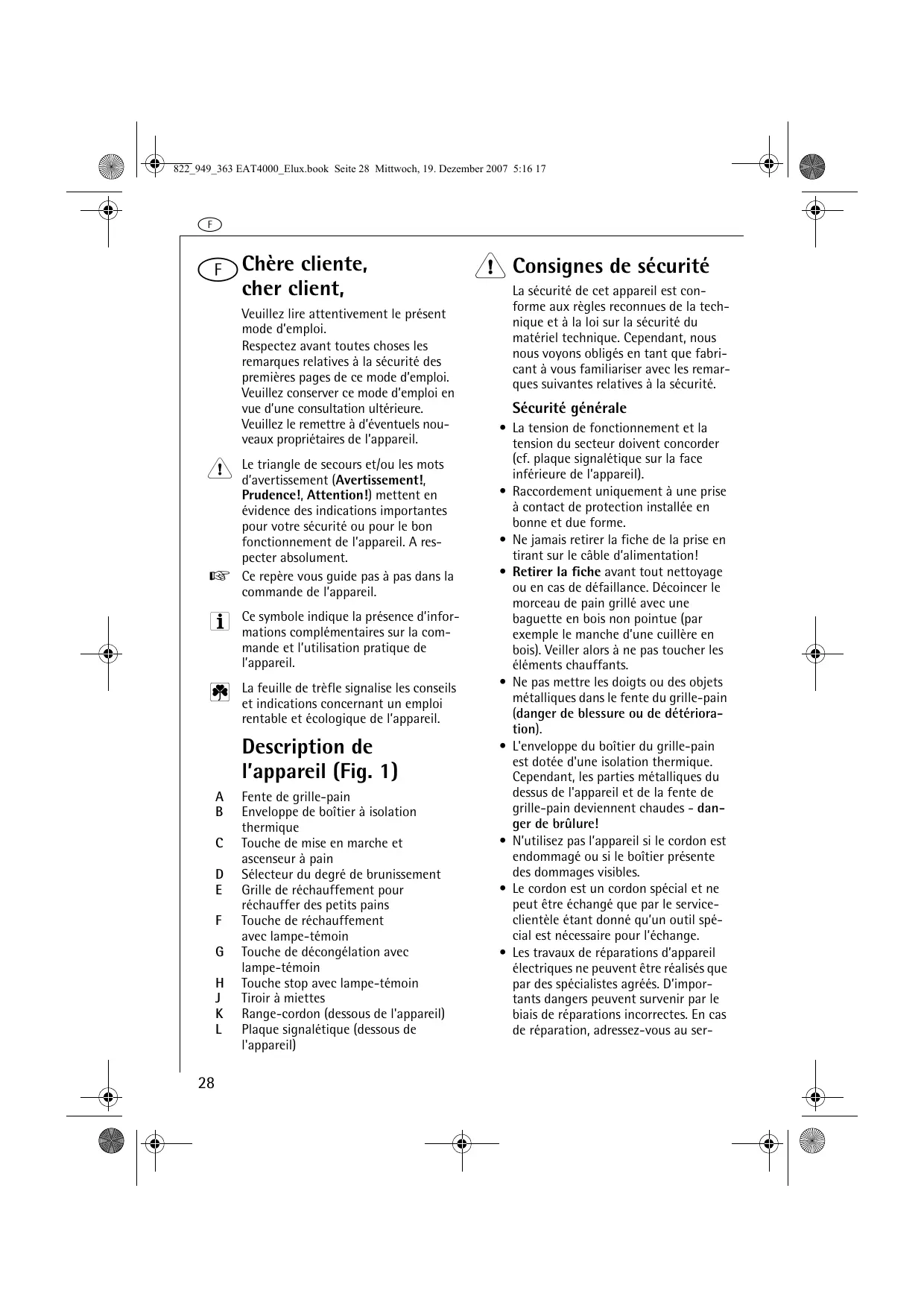 A Fente de grille-pain B Enveloppe de boîtier à isolation thermique C Touche de mise en marche et ascenseur à pain D Sélecteur du degré de brunissement E Grille de réchauffement pour réchauffer des petits pains F Touche de réchauffement avec lampe-témoin G Touche de décongélation avec lampe-témoin H Touche stop avec lampe-témoin J Tiroir à miettes K Range-cordon (dessous de l'appareil) L Plaque signalétique (dessous de l'appareil)
