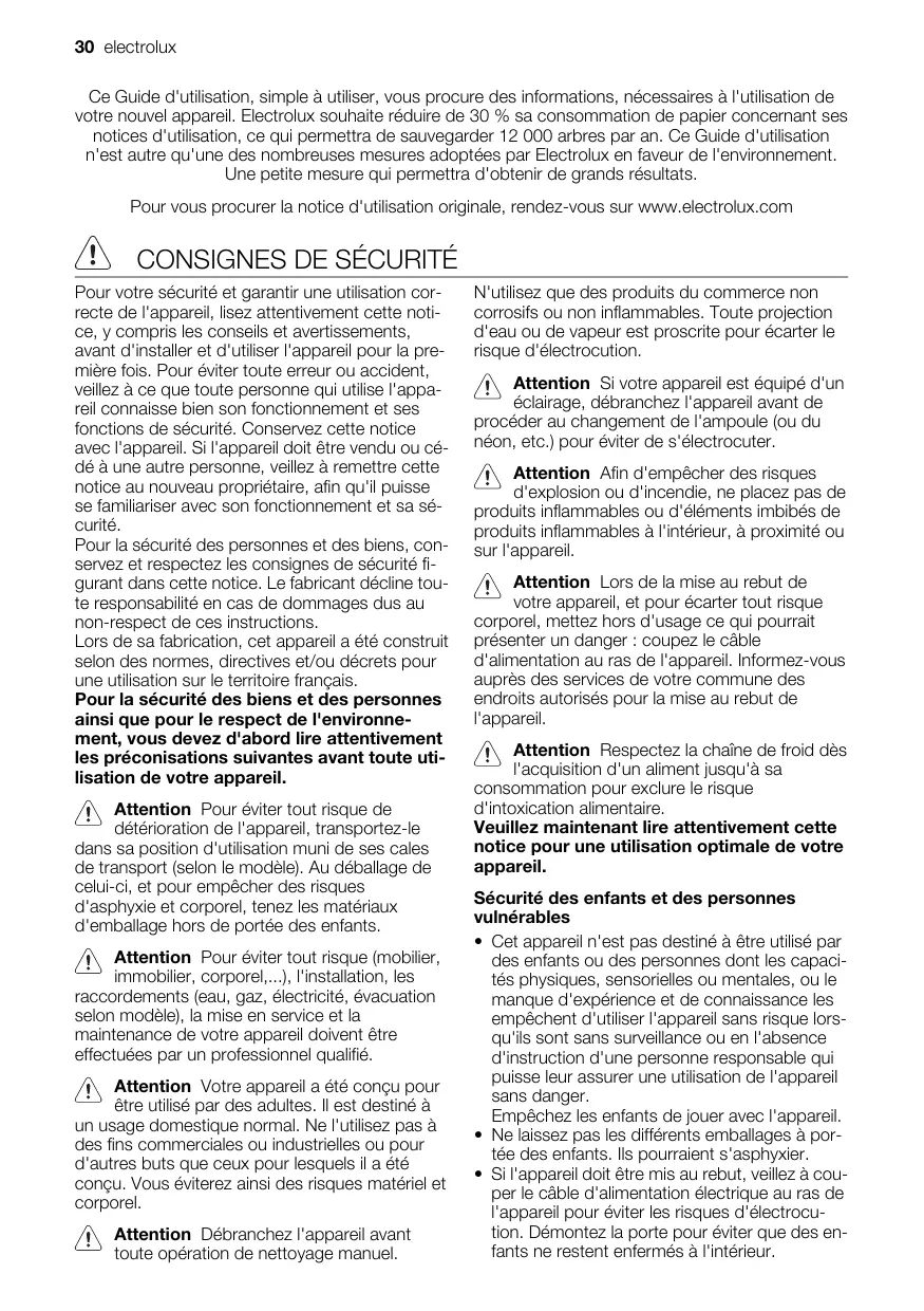 Pour votre sécurité et garantir une utilisation correcte de l'appareil, lisez attentivement cette notice, y compris les conseils et avertissements, avant d'installer et d'utiliser l'appareil pour la première fois. Pour éviter toute erreur ou accident, veillez à ce que toute personne qui utilise l'appareil connaisse bien son fonctionnement et ses fonctions de sécurité. Conservez cette notice avec l'appareil. Si l'appareil doit être vendu ou cédé à une autre personne, veillez à remettre cette notice au nouveau propriétaire, afin qu'il puisse se familiariser avec son fonctionnement et sa sécurité. Pour la sécurité des personnes et des biens, conservez et respectez les consignes de sécurité figurant dans cette notice. Le fabricant décline toute responsabilité en cas de dommages dus au non-respect de ces instructions. Lors de sa fabrication, cet appareil a été construit selon des normes, directives et/ou décrets pour une utilisation sur le territoire français. Pour la sécurité des biens et des personnes ainsi que pour le respect de l'environnement, vous devez d'abord lire attentivement les préconisations suivantes avant toute utilisation de votre appareil. Attention Pour éviter tout risque de détérioration de l'appareil, transportez-le dans sa position d'utilisation muni de ses cales de transport (selon le modèle). Au déballage de celui-ci, et pour empêcher des risques d'asphyxie et corporel, tenez les matériaux d'emballage hors de portée des enfants. Attention Pour éviter tout risque (mobilier, immobilier, corporel,...), l'installation, les raccordements (eau, gaz, électricité, évacuation selon modèle), la mise en service et la maintenance de votre appareil doivent être effectuées par un professionnel qualifié. Attention Votre appareil a été conçu pour être utilisé par des adultes. Il est destiné à un usage domestique normal. Ne l'utilisez pas à des fins commerciales ou industrielles ou pour d'autres buts que ceux pour lesquels il a été conçu. Vous éviterez ainsi des risques matériel et corporel. Attention Débranchez l'appareil avant toute opération de nettoyage manuel. N'utilisez que des produits du commerce non corrosifs ou non inflammables. Toute projection d'eau ou de vapeur est proscrite pour écarter le risque d'électrocution. Attention Si votre appareil est équipé d'un éclairage, débranchez l'appareil avant de procéder au changement de l'ampoule (ou du néon, etc.) pour éviter de s'électrocuter. Attention Afin d'empêcher des risques d'explosion ou d'incendie, ne placez pas de produits inflammables ou d'éléments imbibés de produits inflammables à l'intérieur, à proximité ou sur l'appareil. Attention Lors de la mise au rebut de votre appareil, et pour écarter tout risque corporel, mettez hors d'usage ce qui pourrait présenter un danger : coupez le câble d'alimentation au ras de l'appareil. Informez-vous auprès des services de votre commune des endroits autorisés pour la mise au rebut de l'appareil. Attention Respectez la chaîne de froid dès l'acquisition d'un aliment jusqu'à sa consommation pour exclure le risque d'intoxication alimentaire. Veuillez maintenant lire attentivement cette notice pour une utilisation optimale de votre appareil. Sécurité des enfants et des personnes vulnérables