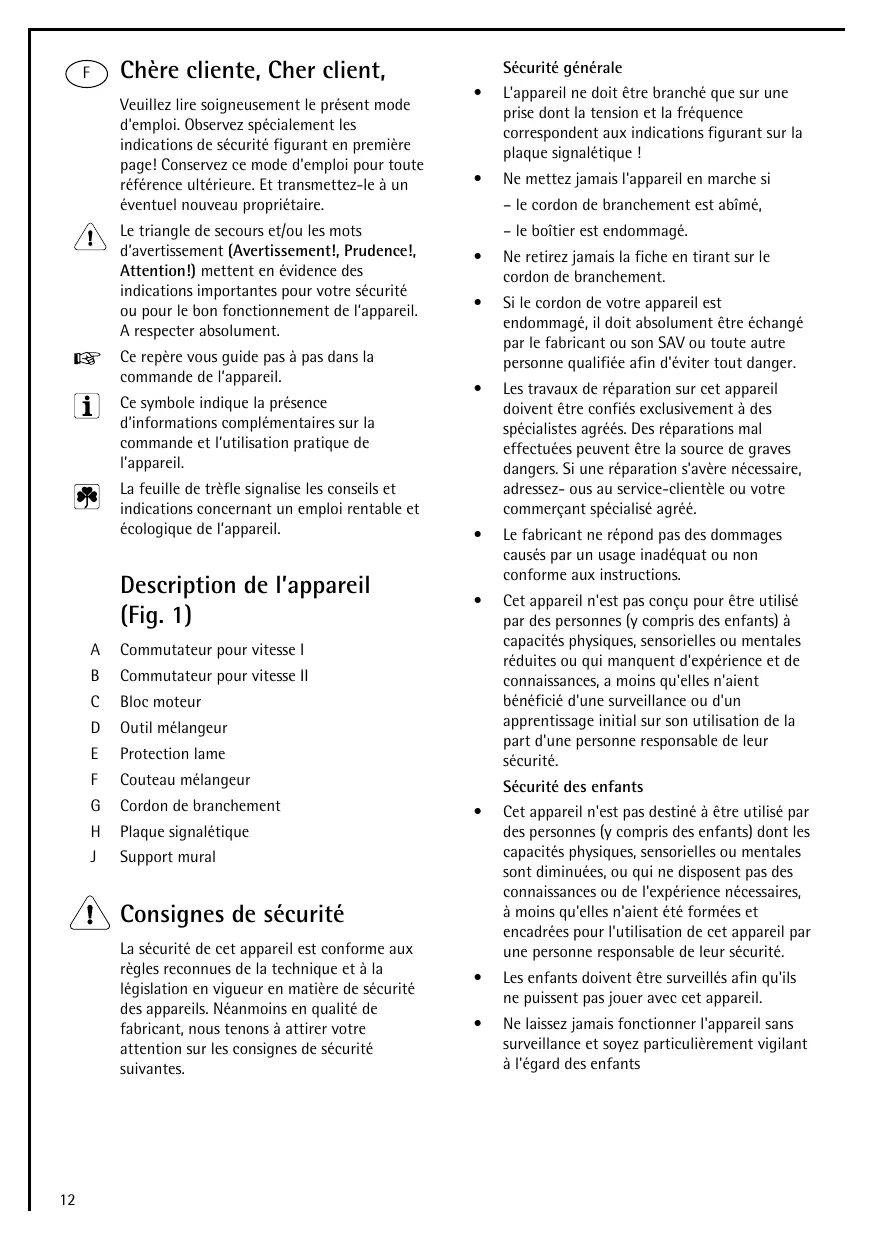 Ne ttoyage rapide En cours d'opération, e ntre de ux tâch e s différe nte s par e xe m pl e , pl ace z l e m ixe ur onge ur dans l e récipie nt à m oitié re m pl d'e au puis faite z- l e fonctionne r pe ndant q ue l q ue s se conde s. Caractéristiq ue s te ch niq ue s Te nsion du rése au: 230 V, 50 H z Puissance consom m ée : Ne ttoyage e t e ntre tie n Ve il e z à ce q ue l e m ixe ur pl onge ur soit débranch é avant d'insére r ou de re tire r de s acce ssoire s pour l e s ne ttoye r ou procéde r à e ur e ntre tie n. Re m arq ue : n'im m e rge z pas l a tige am ovibl du m ixe ur dans l 'e au, car ave c l e te m ps, ce l pourrait détériore r l ubrification de s roul e m e nts. 400 W D urée m axim al e de fonctionne m e nt: 1 m inute ;Ce t appare ile st conform e aux dire ctive s suivante s de l a C.E. :