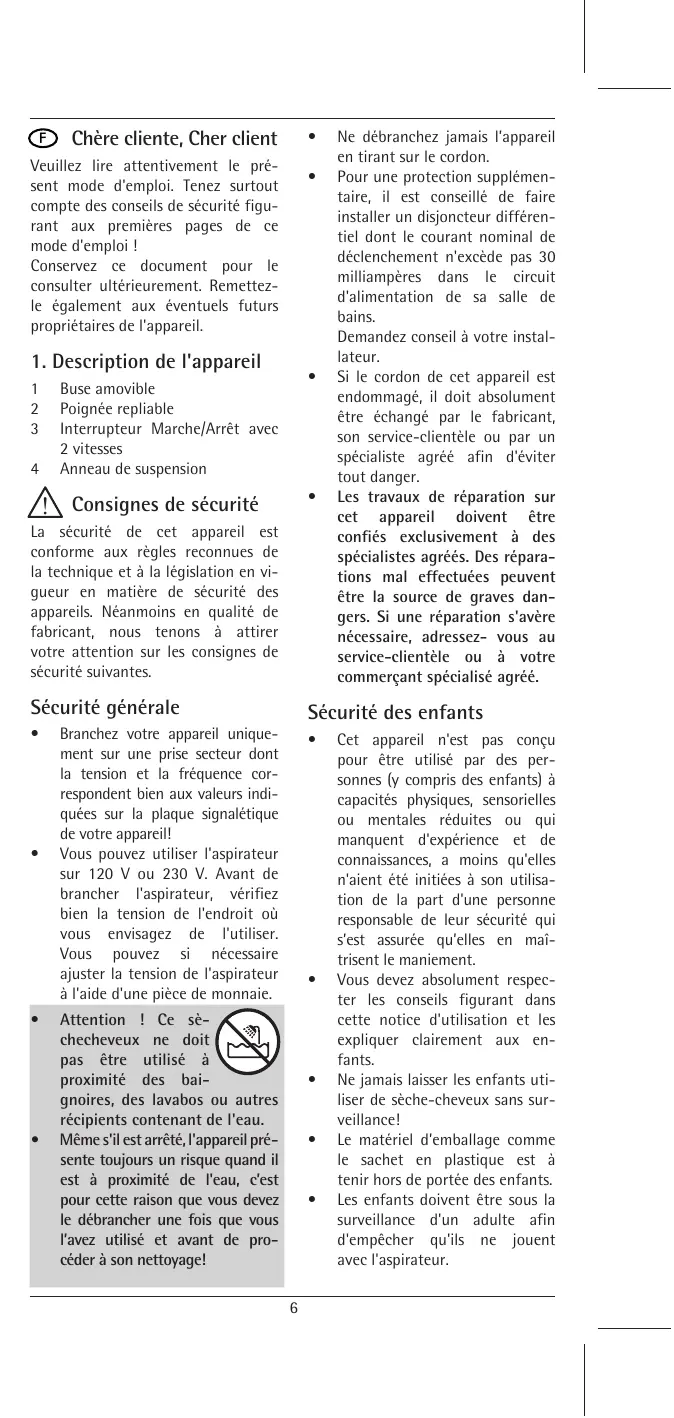 - Atte ntion ! Ce sèch e ch e ve ux ne doit pas être util isé à proxim ité de s baignoire s, de s l avabos ou autre s récipie nts conte nant de l 'e au.