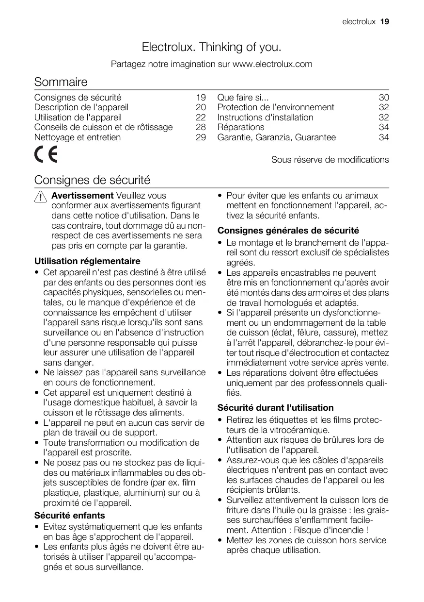 - Sifflement, bourdonnement 3 L'appareil est doté d'un ventilateur servant au refroidissement des composants électriques. Un son de crécelle peut se produire lors du fonctionnement du ventilateur et se poursuivre pendant un moment encore après la mise à l'arrêt de l'appareil. Les bruits décrits sont normaux et ne constituent pas une malfaçon. 32 electrolux Protection de l’environnement Elimination du matériel d’emballage Les matériaux d’emballage sont écologiques et recyclables. Les matières plastiques portent un signe distinctif, par ex. >PE<, >PS<, etc. Eliminez les matériaux d’emballage en fonction de leur signe distinctif dans les containeurs prévus à cet effet sur le site de collecte de votre commune. Appareils usagés Le symbole sur le produit ou son emballage indique que ce produit ne peut être traité comme déchet ménager. Il doit plutôt être remis au point de ramassage concerné, se chargeant du recyclage du matériel électrique et électronique. En vous assurant que ce produit est éliminé correctement, vous favorisez la prévention des conséquences négatives pour l’environnement et la santé humaine qui, sinon, seraient le résultat d’un traitement inapproprié des déchets de ce produit. Pour obtenir plus de détails sur le recyclage de ce produit, veuillez prendre contact avec le bureau municipal de votre région, votre service d’élimination des déchets ménagers ou le magasin où vous avez acheté le produit. Où aller avec les appareils usagés ? Partout où des appareils neufs sont vendus, mais aussi dans un centre de collecte ou une entreprise de récupération officiels S.EN.S. La liste des centres de collecte officiels S.EN.S est disponible sous www.sens.ch. Avertissement Nous vous conseillons de rendre votre ancien appareil inutilisable avant de vous en débarasser et donc de mettre hors d’usage ce qui pourrait représenter un danger. Coupez, par exemple le câble d’alimentation au ras de l’appareil. Instructions d'installation Consignes de sécurité Avertissement Veuillez lire les indications ci-dessous. L'utilisateur est tenu de respecter la législation, la réglementation, les directives et les normes en vigueur dans son pays de résidence (dispositions relatives à la sécurité, recyclage conforme et réglementaire, etc.) Le montage relève de la compétence exclusive de spécialistes. Respectez l'espacement minimal requis entre la table de cuisson et les autres appareils. Lors de l'installation, tenez compte de la protection contre les contacts accidentels. Par exemple, pour les tiroirs installés juste en dessous la table de cuisson, prévoyez un revêtement de protection ou TSB (accessoire de montage vitrocéramique ). Protégez les surfaces découpées contre l'humidité avec un produit d'étanchéité. Le joint comble les fentes entre le plan de travail et l'appareil. Pour les encastrements, protégez le dessous de la table de cuisson contre la vapeur et l'humidité provenant, par exemple, d'un four ou d'un lave-vaisselle. Evitez d'installer la table de cuisson à côté d'une porte ou sous une fenêtre. Les récipients chauds pourraient être renversés par l'ouverture de la fenêtre ou de la porte. Avertissement Le courant électrique peut provoquer des blessures.
