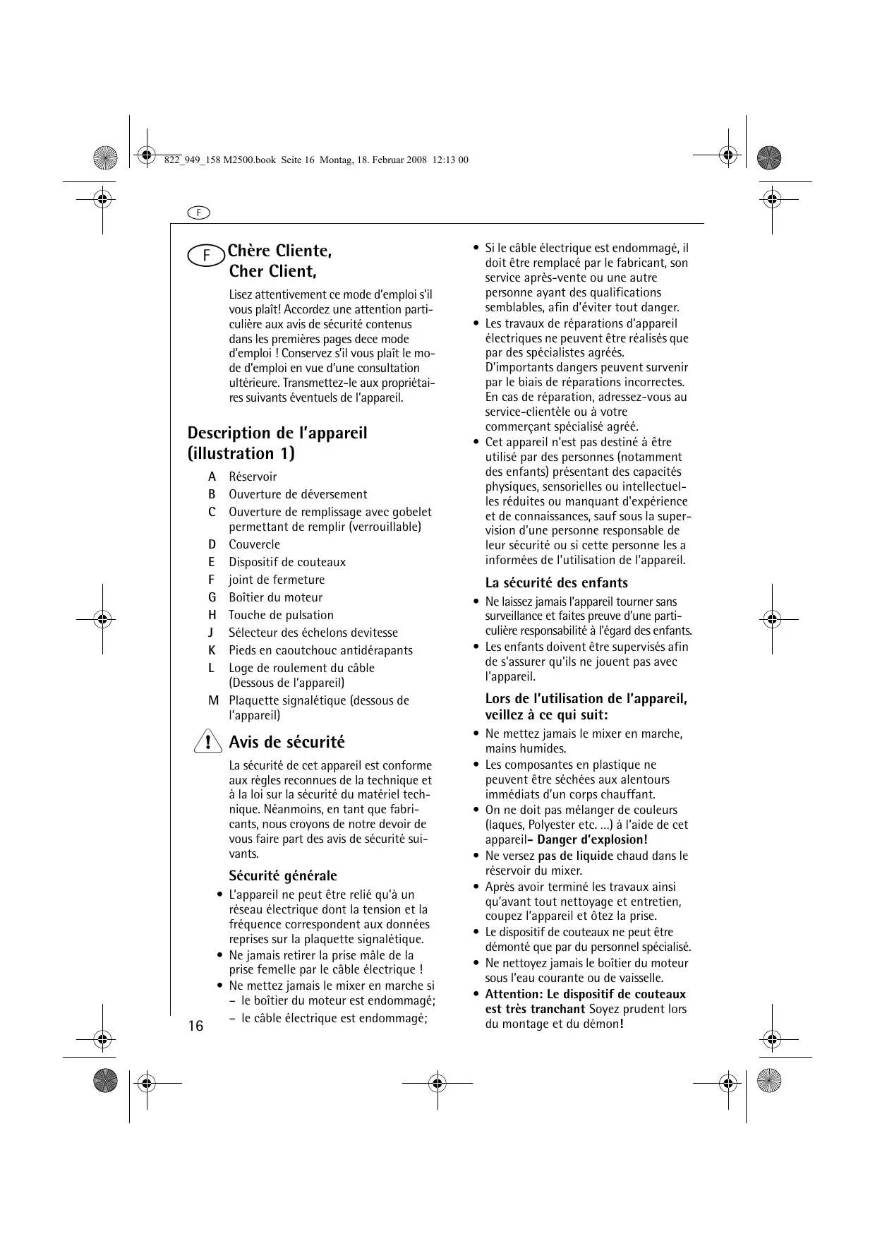 Cliente, fChère Cher Client, Lisez attentivement ce mode d’emploi s’il vous plaît! Accordez une attention particulière aux avis de sécurité contenus dans les premières pages dece mode d’emploi ! Conservez s’il vous plaît le mode d’emploi en vue d’une consultation ultérieure. Transmettez-le aux propriétaires suivants éventuels de l’appareil. Description de l’appareil (illustration 1) A Réservoir B Ouverture de déversement C Ouverture de remplissage avec gobelet permettant de remplir (verrouillable) D Couvercle E Dispositif de couteaux F joint de fermeture G Boîtier du moteur H Touche de pulsation J Sélecteur des échelons devitesse K Pieds en caoutchouc antidérapants L Loge de roulement du câble (Dessous de l’appareil) M Plaquette signalétique (dessous de l’appareil) 1 Avis de sécurité La sécurité de cet appareil est conforme aux règles reconnues de la technique et à la loi sur la sécurité du matériel technique. Néanmoins, en tant que fabricants, nous croyons de notre devoir de vous faire part des avis de sécurité suivants. Sécurité générale