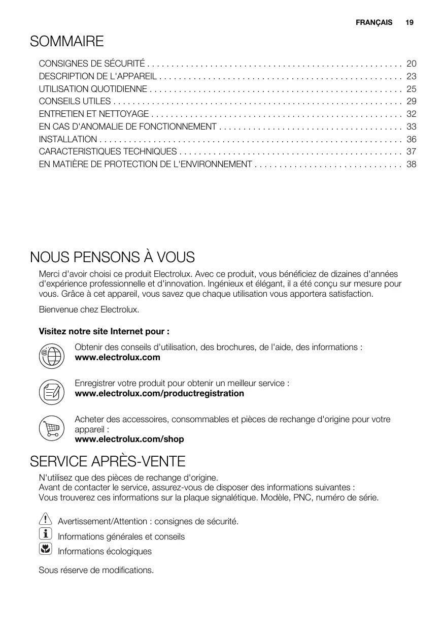 Merci d'avoir choisi ce produit Electrolux. Avec ce produit, vous bénéficiez de dizaines d'années d'expérience professionnelle et d'innovation. Ingénieux et élégant, il a été conçu sur mesure pour vous. Grâce à cet appareil, vous savez que chaque utilisation vous apportera satisfaction. Bienvenue chez Electrolux. Visitez notre site Internet pour : Obtenir des conseils d'utilisation, des brochures, de l'aide, des informations : www.electrolux.com Enregistrer votre produit pour obtenir un meilleur service : www.electrolux.com/productregistration Acheter des accessoires, consommables et pièces de rechange d'origine pour votre appareil : www.electrolux.com/shop