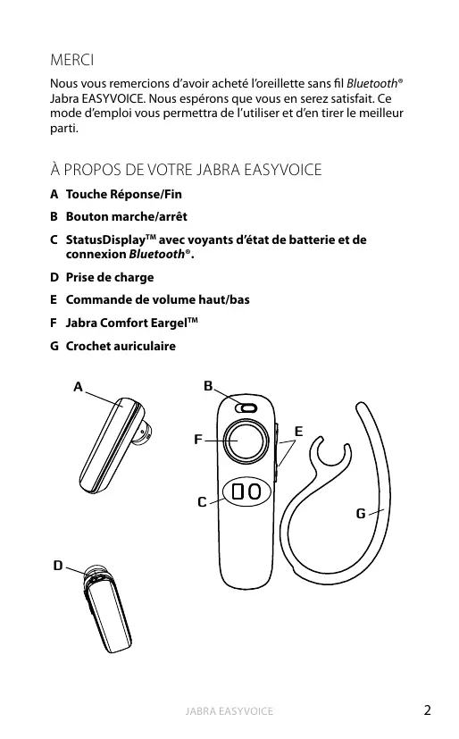 MERCI Nous vous remercions d’avoir acheté l’oreillette sans fil Bluetooth® Jabra EASYVOICE. Nous espérons que vous en serez satisfait. Ce mode d’emploi vous permettra de l’utiliser et d’en tirer le meilleur parti.