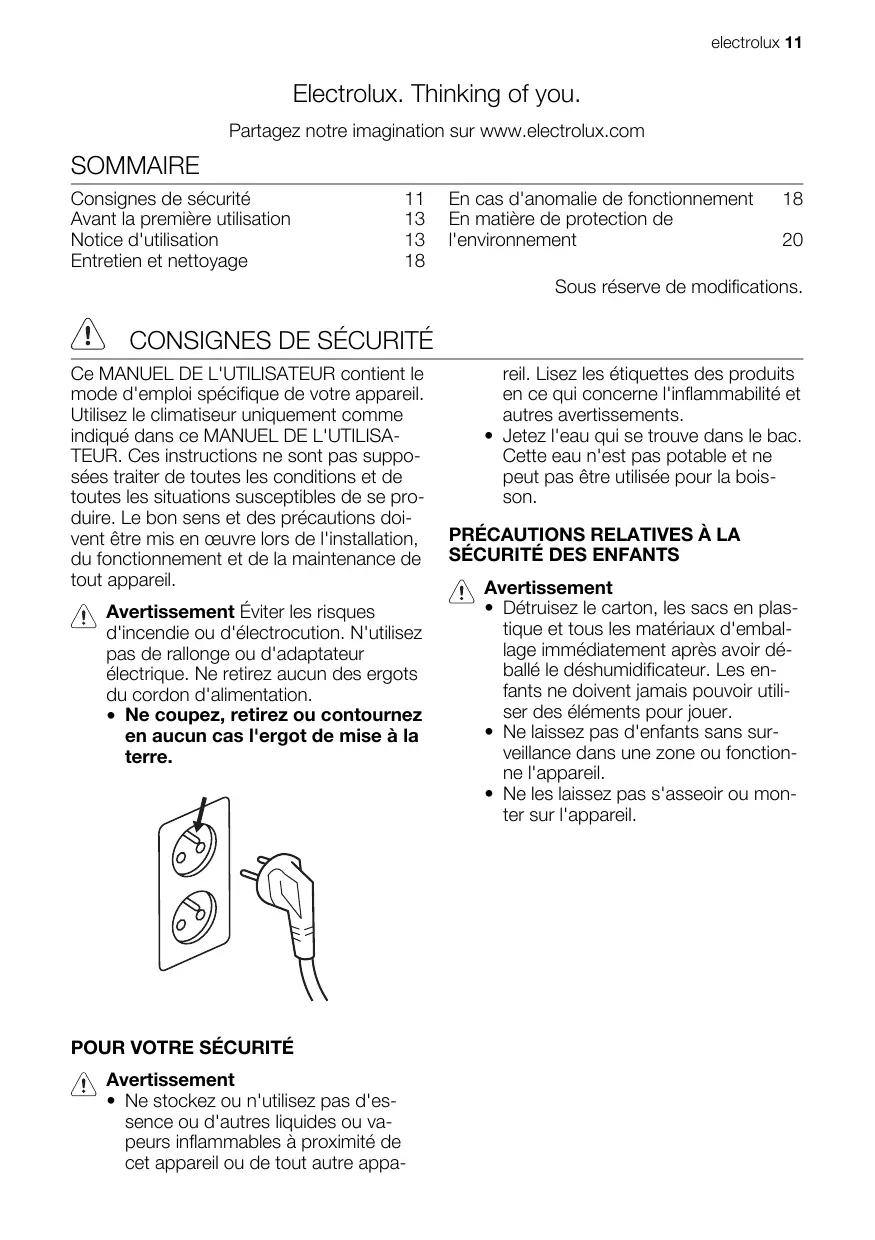 electrolux 11 Electrolux. Thinking of you. Partagez notre imagination sur www.electrolux.com SOMMAIRE Consignes de sécurité 11 En cas d'anomalie de fonctionnement 18 Avant la première utilisation 13 En matière de protection de Notice d'utilisation 13 l'environnement 20 Entretien et nettoyage 18 Sous réserve de modifications. l\ CONSIGNES DE SÉCURITÉ Ce MANUEL DE L'UTILISATEUR contient le reil. Lisez les étiquettes des produits mode d'emploi spécifique de votre appareil. en ce qui concerne l'inflammabilité et Utilisez le climatiseur uniquement comme autres avertissements. indiqué dans ce MANUEL DE L'UTILISA- + Jetez l'eau qui se trouve dans le bac. TEUR. Ces instructions ne sont pas suppo- Cette eau n'est pas potable et ne sées traiter de toutes les conditions et de peut pas être utilisée pour la bois- toutes les situations susceptibles de se pro- Son. duire. Le bon sens et des précautions doi- a à vent être mis en œuvre lors de l'installation, PRÉCAUTIONS RELATIVES À LA du fonctionnement et de la maintenance de SÉCURITÉ DES ENFANTS tout appareil. VAN Avertissement Avertissement Éviter les risques d'incendie ou d'électrocution. N'utilisez pas de rallonge ou d'adaptateur électrique. Ne retirez aucun des ergots du cordon d'alimentation. + Ne coupez, retirez ou contournez en aucun cas l'ergot de mise à la terre.