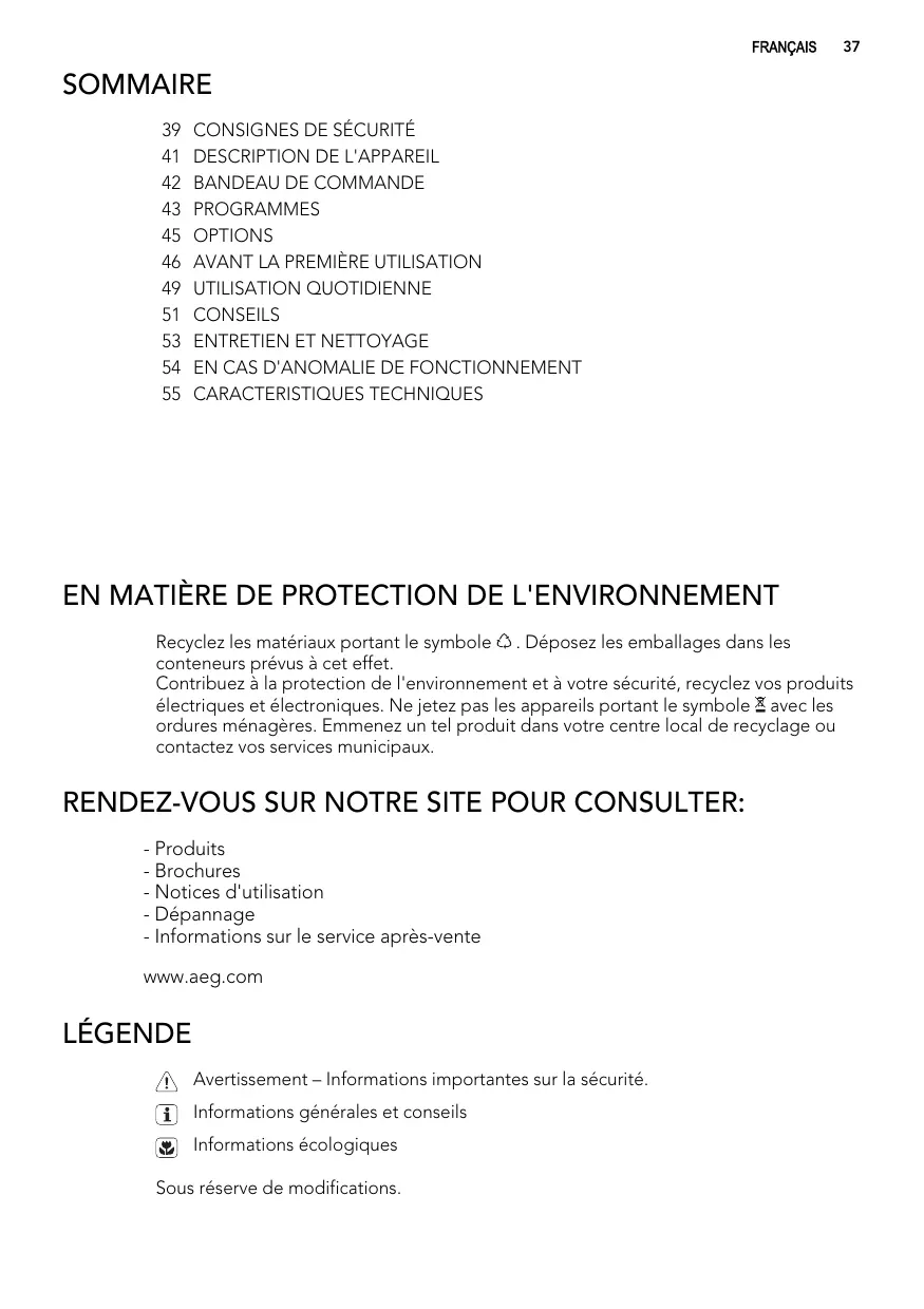 Merci d'avoir choisi ce produit AEG. Nous l'avons conçu pour qu'il vous offre des performances irréprochables pour longtemps, en intégrant des technologies innovantes qui vous simplifient la vie grâce à des caractéristiques que vous ne trouverez pas forcément sur des appareils ordinaires. Veuillez prendre quelques instants pour lire cette notice afin d'utiliser au mieux votre appareil.