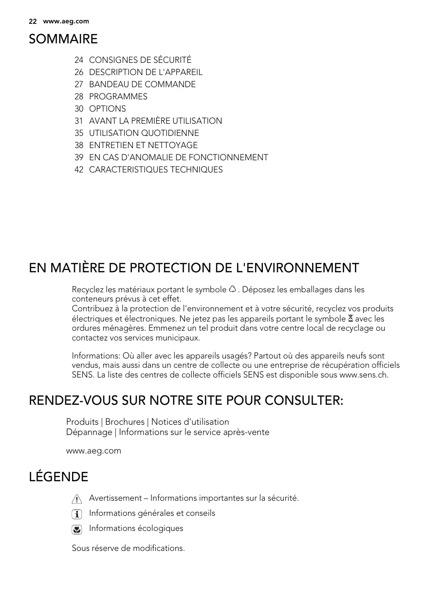 CARACTERISTIQUES TECHNIQUES EN MATIÈRE DE PROTECTION DE L'ENVIRONNEMENT Recyclez les matériaux portant le symbole . Déposez les emballages dans les conteneurs prévus à cet effet. Contribuez à la protection de l'environnement et à votre sécurité, recyclez vos produits électriques et électroniques. Ne jetez pas les appareils portant le symbole avec les ordures ménagères. Emmenez un tel produit dans votre centre local de recyclage ou contactez vos services municipaux. Informations: Où aller avec les appareils usagés? Partout où des appareils neufs sont vendus, mais aussi dans un centre de collecte ou une entreprise de récupération officiels SENS. La liste des centres de collecte officiels SENS est disponible sous www.sens.ch. RENDEZ-VOUS SUR NOTRE SITE POUR CONSULTER: Produits | Brochures | Notices d'utilisation Dépannage | Informations sur le service après-vente www.aeg.com LÉGENDE Avertissement – Informations importantes sur la sécurité. Informations générales et conseils Informations écologiques Sous réserve de modifications. FRANÇAIS