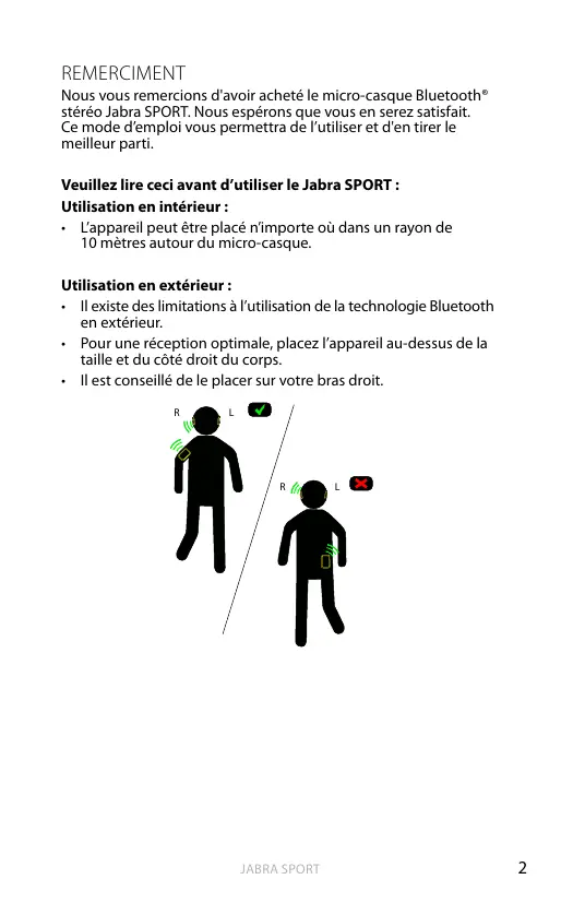 remerciment Nous vous remercions d'avoir acheté le micro-casque Bluetooth® stéréo Jabra SPORT. Nous espérons que vous en serez satisfait. Ce mode d’emploi vous permettra de l’utiliser et d'en tirer le meilleur parti. Veuillez lire ceci avant d’utiliser le Jabra SPORT : Utilisation en intérieur :