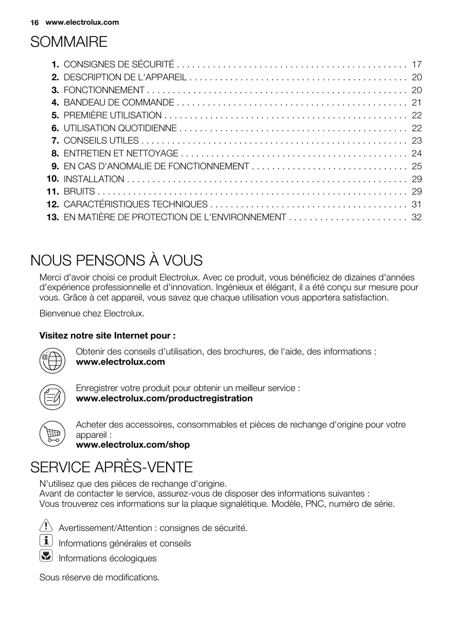 Merci d'avoir choisi ce produit Electrolux. Avec ce produit, vous bénéficiez de dizaines d'années d'expérience professionnelle et d'innovation. Ingénieux et élégant, il a été conçu sur mesure pour vous. Grâce à cet appareil, vous savez que chaque utilisation vous apportera satisfaction.
