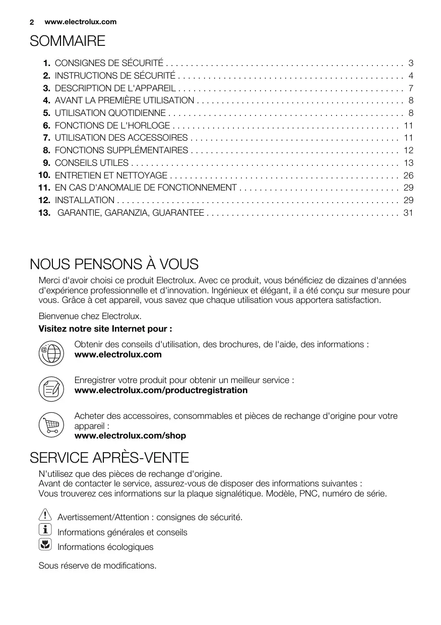 Merci d'avoir choisi ce produit Electrolux. Avec ce produit, vous bénéficiez de dizaines d'années d'expérience professionnelle et d'innovation. Ingénieux et élégant, il a été conçu sur mesure pour vous. Grâce à cet appareil, vous savez que chaque utilisation vous apportera satisfaction. Bienvenue chez Electrolux. Visitez notre site Internet pour : Obtenir des conseils d'utilisation, des brochures, de l'aide, des informations : www.electrolux.com Enregistrer votre produit pour obtenir un meilleur service : www.electrolux.com/productregistration Acheter des accessoires, consommables et pièces de rechange d'origine pour votre appareil : www.electrolux.com/shop