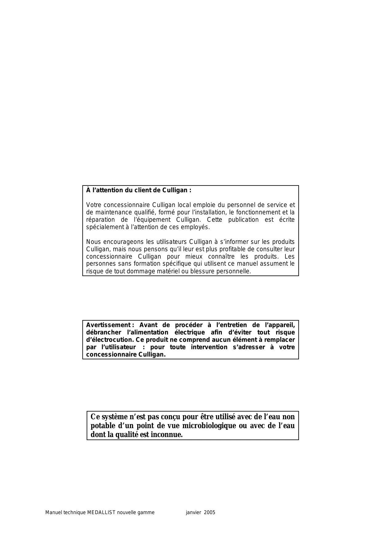 Votre concessionnaire Culligan local emploié du personnel de service et de maintenance qualifié, formé pour l'installation, le fonctionnement et la réparation de l'équipement Culligan. Cette publication est écrite spécialement à l'attention de ces employés.