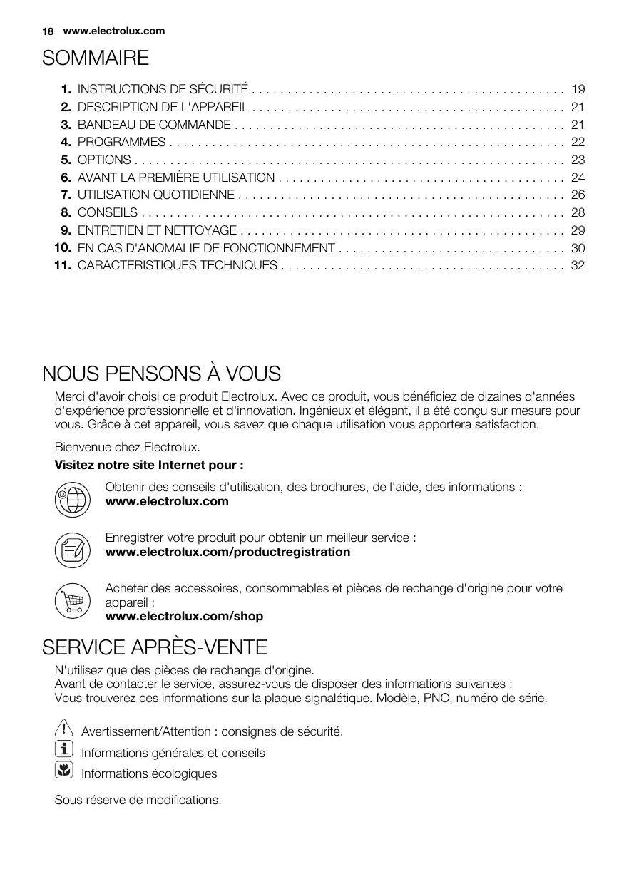 Merci d'avoir choisi ce produit Electrolux. Avec ce produit, vous bénéficiez de dizaines d'années d'expérience professionnelle et d'innovation. Ingénieux et élégant, il a été conçu sur mesure pour vous. Grâce à cet appareil, vous savez que chaque utilisation vous apportera satisfaction. Bienvenue chez Electrolux. Visitez notre site Internet pour : Obtenir des conseils d'utilisation, des brochures, de l'aide, des informations : www.electrolux.com Enregistrer votre produit pour obtenir un meilleur service : www.electrolux.com/productregistration Acheter des accessoires, consommables et pièces de rechange d'origine pour votre appareil : www.electrolux.com/shop