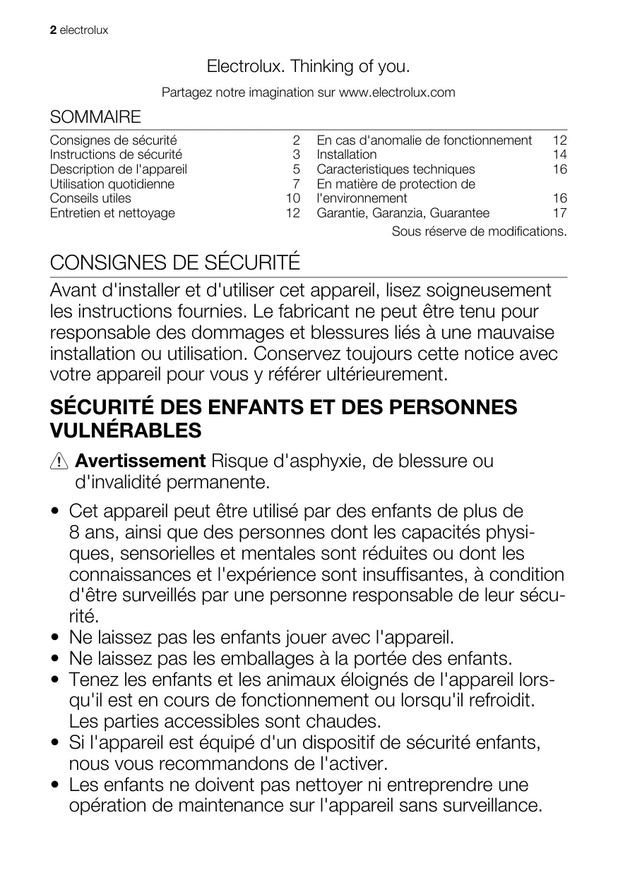 NOTICE D'UTILISATION 2 electrolux Electrolux. Thinking of you. Partagez notre imagination sur www.electrolux.com SOMMAIRE Consignes de sécurité Instructions de sécurité Description de l'appareil Utilisation quotidienne Conseils utiles Entretien et nettoyage