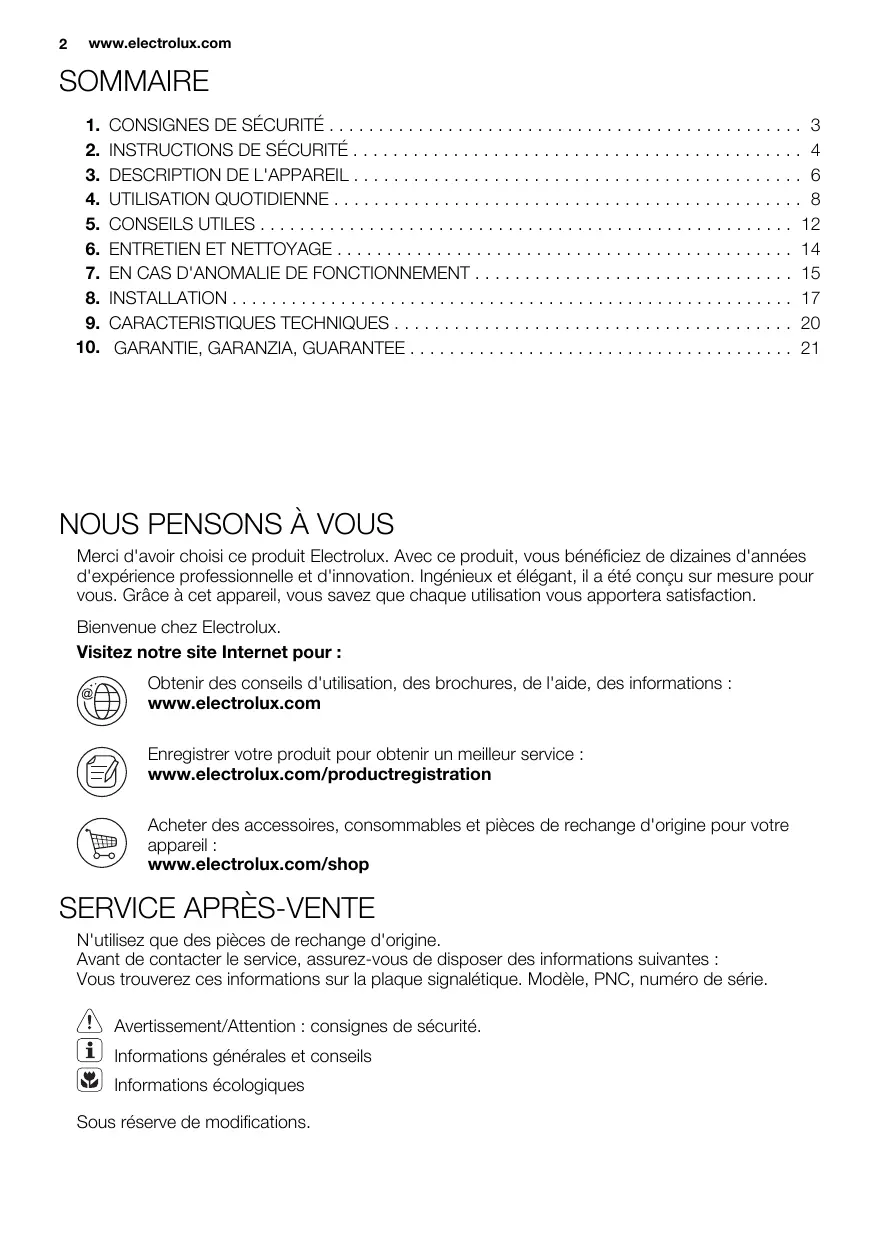 Merci d'avoir choisi ce produit Electrolux. Avec ce produit, vous bénéficiaz de dizaines d'années d'expérience professionnelle et d'innovation. Ingénieux et élégant, il a été concu sur mesure pour vous. Grâce à cet apparéil, vous savez que chaque utilisation vous apportera satisfaction.