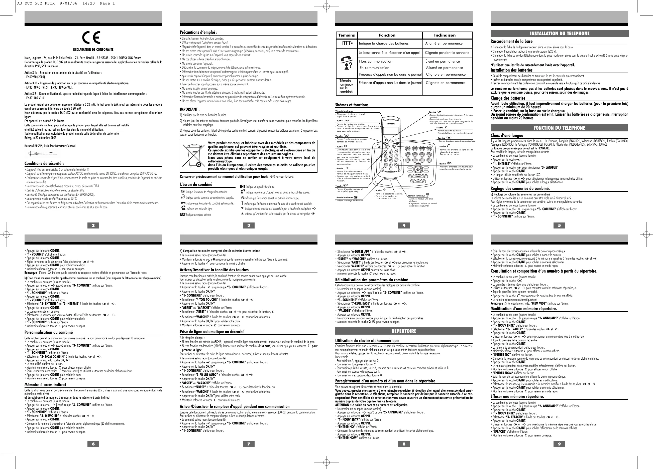 Nous, Logicom - 74, rue de la Belle Etoile - Z.I. Paris Nord II - B.P. 58338 - 95941 ROISSY CDG France Déclarons que le produit DUO 502 est en conformité avec les exigences essentielles applicables et en particulier celles de la directive 1999/5/CE suivantes : Article 3.1a - Protection de la santé et de la sécurité de l’utilisateur : - EN60950 (2000) Article 3.1b - Exigences de protection en ce qui concerne la compatibilité électromagnétique: - EN301489-01 V1.3.1, EN301489-06 V1.1.1 Article 3.2 - Bonne utilisation du spectre radioélectrique de façon à éviter les interférences dommageables : - EN301406 V1.4.1 Le produit ayant une puissance moyenne inférieure à 20 mW, le test pour le SAR n’est pas nécessaire pour les produits ayant une puissance inférieure ou égale à 20 mW. Nous déclarons que le produit DUO 502 est en conformité avec les exigences liées aux normes européennes d’interfaces lignes. Cet appareil est destiné à la France. Cette conformité s’entend pour autant que le produit pour lequel elle est donnée est installé et utilisé suivant les instructions fournies dans le manuel d’utilisation. Toute modification non autorisée du produit annule cette déclaration de conformité. Roissy, le 20 décembre 2005 Bernard BESSIS, Président Directeur Général 2) Ne pas jeter les batteries au feu ou dans une poubelle. Renseignez-vous auprès de votre revendeur pour connaître les dispositions spéciales pour leur recyclage. 3) Ne pas ouvrir les batteries, l’électrolyte qu’elles contiennent est corrosif, et pourrait causer des brûlures aux mains, à la peau et aux yeux et serait toxique si on l’avalait. Indique que la sonnerie du combiné est coupée. Indique que la fonction secret est activée (micro coupé). Indique que le clavier du combiné est verrouillé. Indique que la liaison radio entre la base et le combiné est possible. Indique qu’une fonction est accessible par la touche de navigation Indique qu’une fonction est accessible par la touche de navigation Indique une prise de ligne Hors communication Éteint en permanence En communication Allumé en permanence Présence d’appels non lus dans le journal Clignote en permanence Présence d’appels non lus dans le journal Clignote en permanence b) Composition du numéro enregistré dans la mémoire à accès indirect