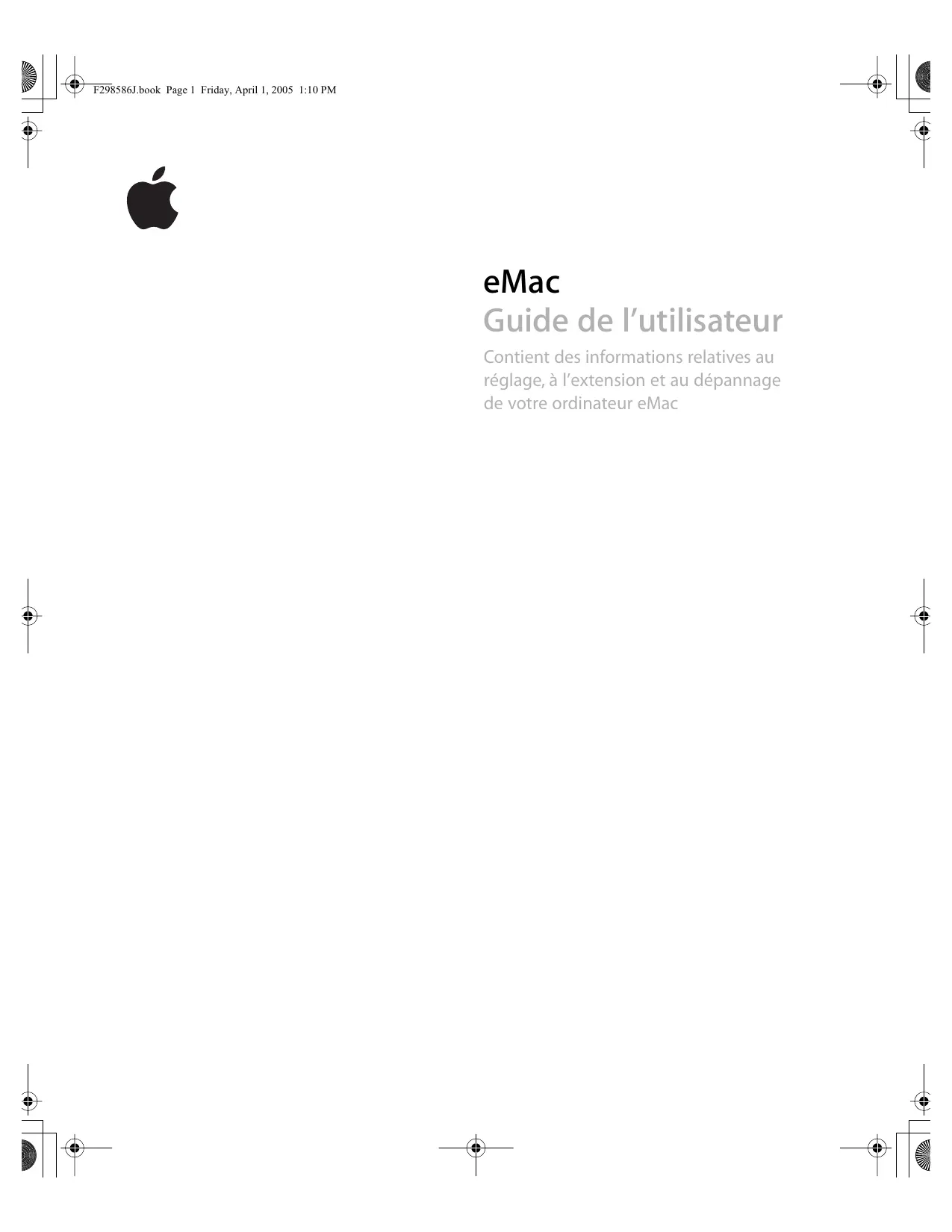 concurrence déloyale. Tout a été mis en œuvre pour que les informations présentées dans ce manuel soient exactes. Apple n’est pas responsable des erreurs de reproduction ou d’impression. Apple 1 Infinite Loop Cupertino, CA 95014-2084 408-996-1010 www.apple.com Apple, le logo Apple, AirPort, AppleTalk, Final Cut, Final Cut Pro, FireWire, iCal, iLife, iMovie, iPod, iTunes, Mac, Macintosh, Mac OS et QuickTime sont des marques d’Apple Computer, Inc. déposées aux États-Unis et dans d’autres pays. AirPort Express, eMac, Finder, iDVD, iPhoto, iSight, Safari et SuperDrive sont des marques d’Apple Computer, Inc. La marque et les logos Bluetooth sont la propriété de Bluetooth SIG, Inc. et sont utilisés sous licence par Apple Computer, Inc. ENERGY STAR® est une marque déposée aux États-Unis. Les autres noms de produits et de sociétés sont la propriété de leurs détenteurs respectifs. Les produits commercialisés par des entreprises tierces ne sont mentionnés que pour information, sans aucune intention de préconisation ni de recommandation. Apple décline toute responsabilité quant à l’utilisation et au fonctionnement de ces produits. Fabriqué sous licence de Dolby Laboratories. “Dolby”, “Pro Logic” et le logo double-D sont des marques déposées de Dolby Laboratories. Travaux confidentiels inédits. © 1992–1997 Dolby Laboratories, Inc. Tous droits réservés. Le produit décrit dans le présent manuel intègre des technologies de protection de droits d’auteur elles-mêmes protégées par divers brevets américains ainsi que d’autres droits de propriété intellectuelle appartenant à Macrovision Corporation et à d’autres détenteurs. L’utilisation de ces technologies de protection des droits d’auteurs doit être autorisée par Macrovision Corporation et est destinée à un cadre privé ou de visualisation restreinte, sauf consentement de Macrovision Corporation. Tout démontage ou ingénierie inverse est interdit. AppleCare et Apple Store sont des marques de service d’Apple Computer, Inc. déposées aux États-Unis et dans d’autres pays. Réclamations concernant l’appareillage aux États-Unis. Brevets n° 4,631,603, 4,577,216, 4,819,098 et 4,907,093 sous licence à des fins de visualisation limitée uniquement. .Mac est une marque de service d’Apple Computer, Inc. Publié simultanément aux États-Unis et au Canada. F298586J.book Page 3 Friday, April 1, 2005 1:10 PM