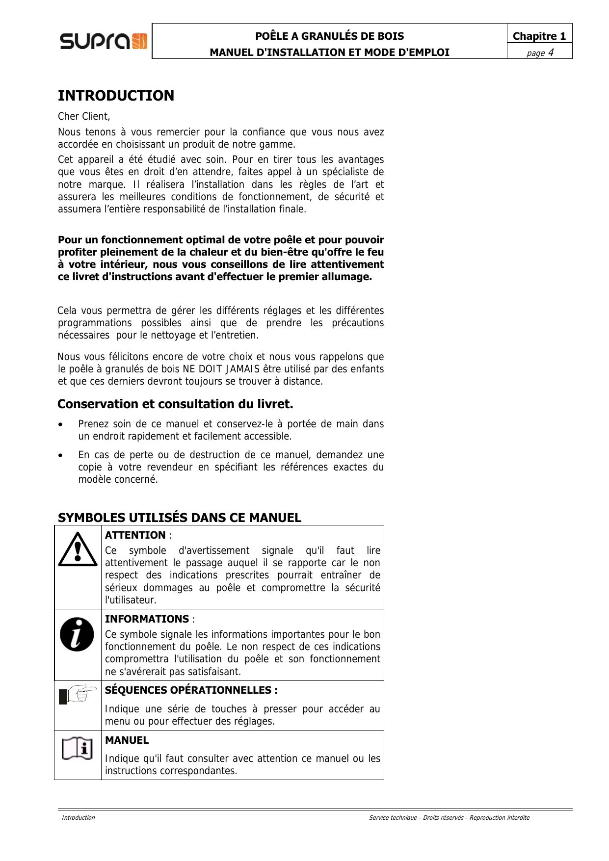 ATTENTION : Ce symbole d'avertissement signale qu'il faut lire attentivement le passage auquel il se rapporte car le non respect des indications prescrites pourrait entraîner de sérieux dommages au poêle et compromettre la sécurité l'utilisateur. INFORMATIONS : Ce symbole signale les informations importantes pour le bon fonctionnement du poêle. Le non respect de ces indications compromettra l'utilisation du poêle et son fonctionnement ne s'avérerait pas satisfaisant. SÉQUENCES OPÉRATIONNELLES : Indique une série de touches à presser pour accéder au menu ou pour effectuer des réglages. MANUEL Indique qu'il faut consulter avec attention ce manuel ou les instructions correspondantes. Introduction Service technique - Droits réservés - Reproduction interdite
