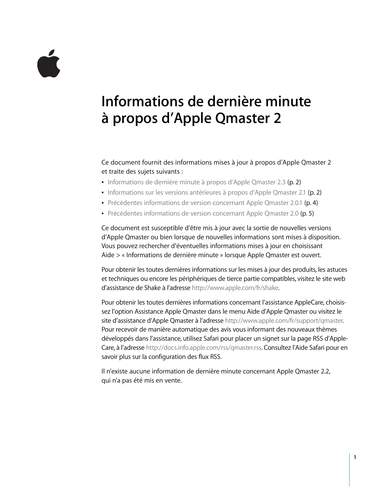 Informations de dernière minute à propos d’Apple Qmaster 2 Ce document fournit des informations mises à jour à propos d’Apple Qmaster 2 et traite des sujets suivants : Â Informations de dernière minute à propos d’Apple Qmaster 2.3 (p. 2) Â Informations sur les versions antérieures à propos d’Apple Qmaster 2.1 (p. 2) Â Précédentes informations de version concernant Apple Qmaster 2.0.1 (p. 4) Â Précédentes informations de version concernant Apple Qmaster 2.0 (p. 5) Ce document est susceptible d’être mis à jour avec la sortie de nouvelles versions d’Apple Qmaster ou bien lorsque de nouvelles informations sont mises à disposition. Vous pouvez rechercher d’éventuelles informations mises à jour en choisissant Aide > « Informations de dernière minute » lorsque Apple Qmaster est ouvert. Pour obtenir les toutes dernières informations sur les mises à jour des produits, les astuces et techniques ou encore les périphériques de tierce partie compatibles, visitez le site web d’assistance de Shake à l’adresse http://www.apple.com/fr/shake. Pour obtenir les toutes dernières informations concernant l’assistance AppleCare, choisissez l’option Assistance Apple Qmaster dans le menu Aide d’Apple Qmaster ou visitez le site d’assistance d’Apple Qmaster à l’adresse http://www.apple.com/fr/support/qmaster. Pour recevoir de manière automatique des avis vous informant des nouveaux thèmes développés dans l’assistance, utilisez Safari pour placer un signet sur la page RSS d’AppleCare, à l’adresse http://docs.info.apple.com/rss/qmaster.rss. Consultez l’Aide Safari pour en savoir plus sur la configuration des flux RSS. Il n’existe aucune information de dernière minute concernant Apple Qmaster 2.2, qui n’a pas été mis en vente.