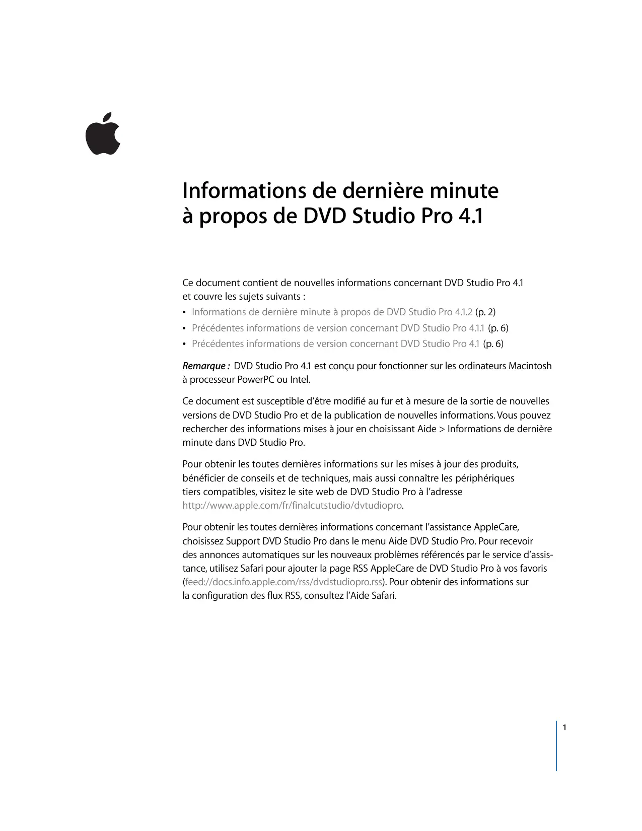 Informations de dernière minute à propos de DVD Studio Pro 4.1 Ce document contient de nouvelles informations concernant DVD Studio Pro 4.1 et couvre les sujets suivants : Â Informations de dernière minute à propos de DVD Studio Pro 4.1.2 (p. 2) Â Précédentes informations de version concernant DVD Studio Pro 4.1.1 (p. 6) Â Précédentes informations de version concernant DVD Studio Pro 4.1 (p. 6) Remarque : DVD Studio Pro 4.1 est conçu pour fonctionner sur les ordinateurs Macintosh à processeur PowerPC ou Intel. Ce document est susceptible d’être modifié au fur et à mesure de la sortie de nouvelles versions de DVD Studio Pro et de la publication de nouvelles informations. Vous pouvez rechercher des informations mises à jour en choisissant Aide > Informations de dernière minute dans DVD Studio Pro. Pour obtenir les toutes dernières informations sur les mises à jour des produits, bénéficier de conseils et de techniques, mais aussi connaître les périphériques tiers compatibles, visitez le site web de DVD Studio Pro à l’adresse http://www.apple.com/fr/finalcutstudio/dvtudiopro. Pour obtenir les toutes dernières informations concernant l’assistance AppleCare, choisissez Support DVD Studio Pro dans le menu Aide DVD Studio Pro. Pour recevoir des annonces automatiques sur les nouveaux problèmes référencés par le service d’assistance, utilisez Safari pour ajouter la page RSS AppleCare de DVD Studio Pro à vos favoris (feed://docs.info.apple.com/rss/dvdstudiopro.rss). Pour obtenir des informations sur la configuration des flux RSS, consultez l’Aide Safari.