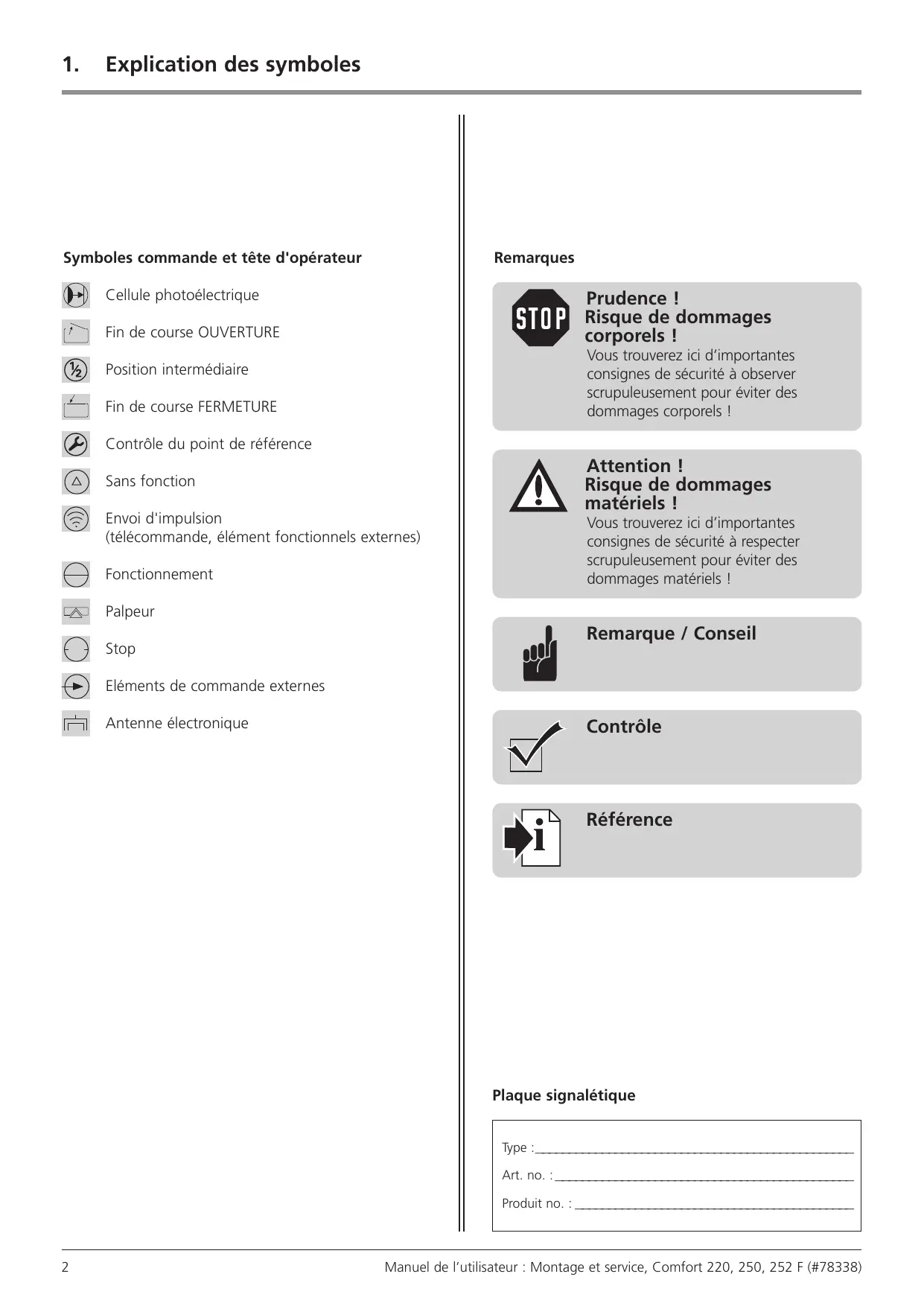 500 N 700 N 1000 N 140 mm/s 15 s env. Environnement - Dimensions de la tête d’opérateur 160x215x395 mm - Poids Comfort 220 5,90 kg Comfort 250 6,60 kg Comfort 252 6,70 kg - Plage de température -20 à +60 °C Caractéristiques/ Fonctions de sécurité - Technique du point de référence - Démarrage progressif/ arrêt progressif - Sécurité anti-effraction - Arrêt automatique de sécurité - Dispositif anti-blocage - Protection contre la sous-tension - Limitation du temps de marche - Déconnexion terminale électronique - Branchement pour le bouton-poussoir, le digicodeur et le contacteur à clé - Branchement du contact de fin de course libre de potentiel - Signalisation des erreurs Accessoires - Antenne électronique sur connecteur externe 868 MHz, IP 65 - Consoles à encastrer pour portes sectionnelles - Kits de déverrouillage pour les portes basculantes - Bras courbé pour portes basculantes - Ferrure pour portes à battants - Cellules photoélectriques - Déclenchement d’urgence - Relais pour feu clignotant lors de la mise en service du dispositif de fermeture automatique - Kit pour équipement ultérieur de contacteur fin de course libre de potentiel OUVERTURE/ FERMETURE/ ECLAIRAGE - Bouton-poussoir - Contacteur à clé - Digicodeur Fournitures - Tête d'opérateur Comfort 220, 250, 252 avec unité électronique intégrée - Télécommande Multibit, 868 MHz, Digital 302 mini émetteur portable à 2 canaux, - Télécommande Multibit, 868 MHz, Digital 302 micro émetteur portable à 3 canaux, (Comfort 250, 252 uniquement) Manuel de l’utilisateur : Montage et service, Comfort 220, 250, 252 F (#78338)
