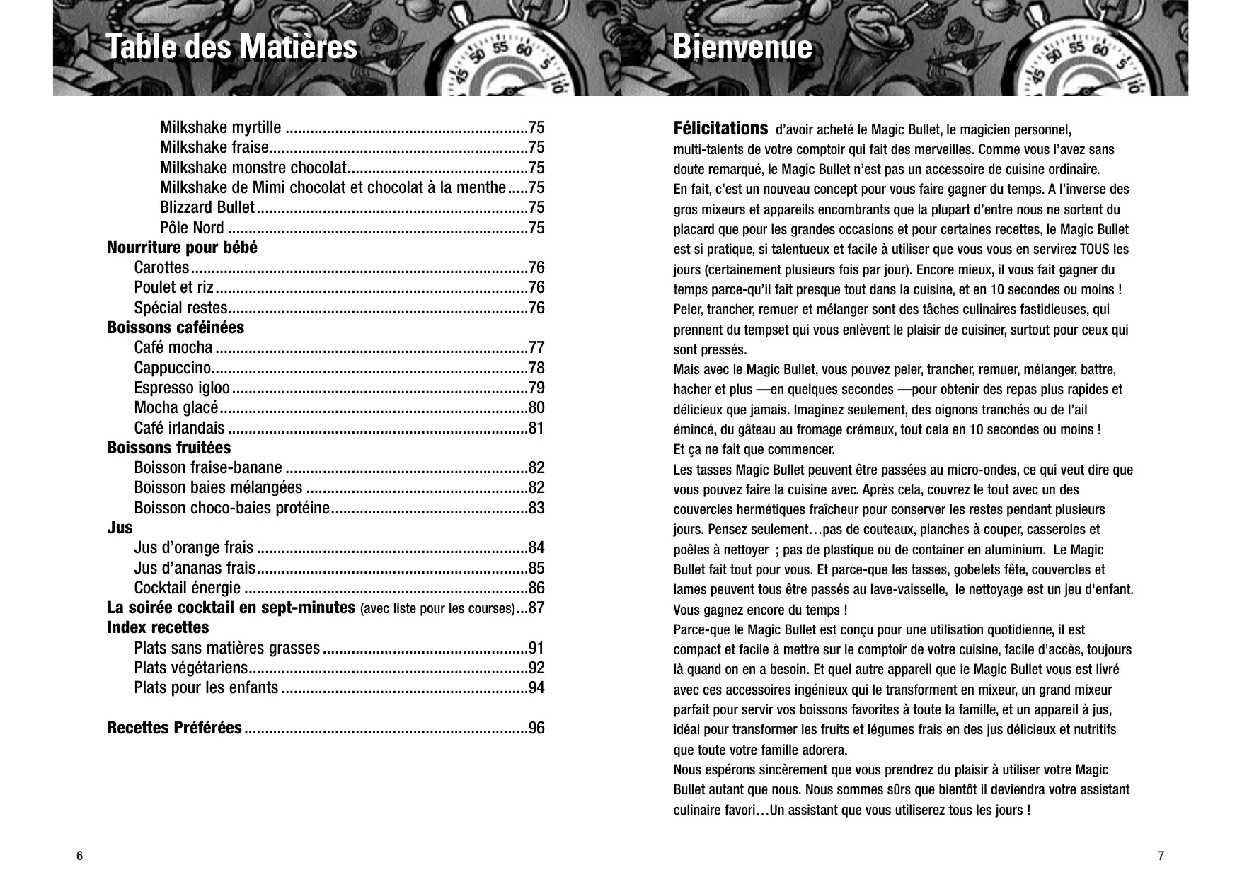 d’avoir acheté le Magic Bullet, le magicien personnel, multi-talents de votre comptoir qui fait des merveilles. Comme vous l’avez sans doute remarqué, le Magic Bullet n’est pas un accessoire de cuisine ordinaire. En fait, c’est un nouveau concept pour vous faire gagner du temps. A l’inverse des gros mixeurs et appareils encombrants que la plupart d’entre nous ne sortent du placard que pour les grandes occasions et pour certaines recettes, le Magic Bullet est si pratique, si talentueux et facile à utiliser que vous vous en servirez TOUS les jours (certainement plusieurs fois par jour). Encore mieux, il vous fait gagner du temps parce-qu’il fait presque tout dans la cuisine, et en 10 secondes ou moins ! Peler, trancher, remuer et mélanger sont des tâches culinaires fastidieuses, qui prennent du tempset qui vous enlèvent le plaisir de cuisiner, surtout pour ceux qui sont pressés. Mais avec le Magic Bullet, vous pouvez peler, trancher, remuer, mélanger, battre, hacher et plus —en quelques secondes —pour obtenir des repas plus rapides et délicieux que jamais. Imaginez seulement, des oignons tranchés ou de l’ail émincé, du gâteau au fromage crémeux, tout cela en 10 secondes ou moins ! Et ça ne fait que commencer. Les tasses Magic Bullet peuvent être passées au micro-ondes, ce qui veut dire que vous pouvez faire la cuisine avec. Après cela, couvrez le tout avec un des couvercles hermétiques fraîcheur pour conserver les restes pendant plusieurs jours. Pensez seulement…pas de couteaux, planches à couper, casseroles et poêles à nettoyer ; pas de plastique ou de container en aluminium. Le Magic Bullet fait tout pour vous. Et parce-que les tasses, gobelets fête, couvercles et lames peuvent tous être passés au lave-vaisselle, le nettoyage est un jeu d'enfant. Vous gagnez encore du temps ! Parce-que le Magic Bullet est conçu pour une utilisation quotidienne, il est compact et facile à mettre sur le comptoir de votre cuisine, facile d'accès, toujours là quand on en a besoin. Et quel autre appareil que le Magic Bullet vous est livré avec ces accessoires ingénieux qui le transforment en mixeur, un grand mixeur parfait pour servir vos boissons favorites à toute la famille, et un appareil à jus, idéal pour transformer les fruits et légumes frais en des jus délicieux et nutritifs que toute votre famille adorera. Nous espérons sincèrement que vous prendrez du plaisir à utiliser votre Magic Bullet autant que nous. Nous sommes sûrs que bientôt il deviendra votre assistant culinaire favori…Un assistant que vous utiliserez tous les jours !