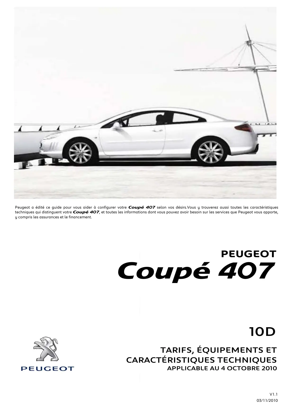 Peugeot a édité ce guide pour vous aider à configurer votre Coupé 407 selon vos désirs.Vous y trouverez aussi toutes Les caractéristiques techniques qui distinguent votre Coupé 4O7, et toutes Les informations dont vous pouvez avoir besoin sur Les services que Peugeot vous apporte, y compris les assurances et Le financement. PEUGEOT Coupé 407 10D