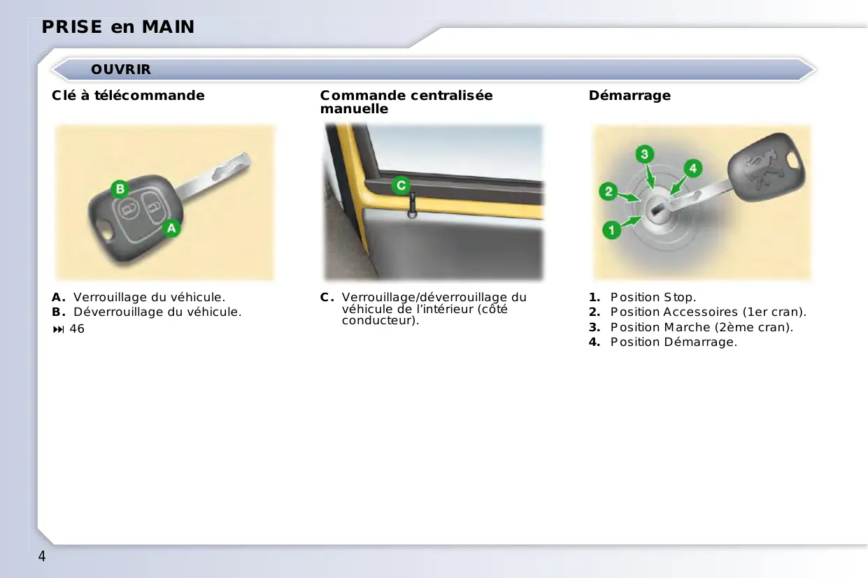 Clé à télécommande Commande centralisée manuelle Démarrage A. Verrouillage du véhicule. B. Déverrouillage du véhicule.